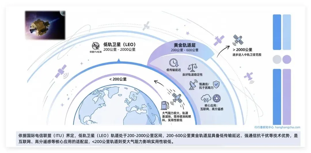 ITU界定200-2000公里为低轨卫星轨道,200-600公里黄金层适配核心应用: