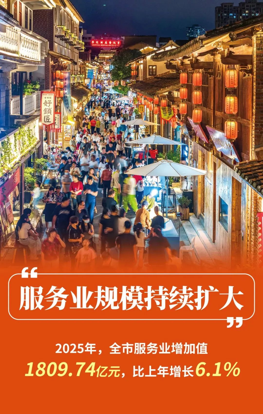 (三)服务业规模持续扩大,现代服务业引领发展。2025年,全市服务业增加值占GDP比重达50.6%,比上年提高0.5个百分点,对GDP增长贡献率为54.8%。一是批发和零售业平稳增长。批发和零售业增加值增长7.8%,拉动GDP增长1.3个百分点。限额以上批发业商品销售额增长4.8%、限额以上零售业商品销售额增长10.7%。二是营利性服务业较快增长。营利性服务业增加值增长10.6%,拉动GDP增长1.1个百分点。1-11月,规模以上水利、环境和公共设施管理业,互联网和相关服务、软件和信息技术服务业,文化、体育和娱乐业等重点行业营业收入分别增长32.0%、31.2%和28.3%。
