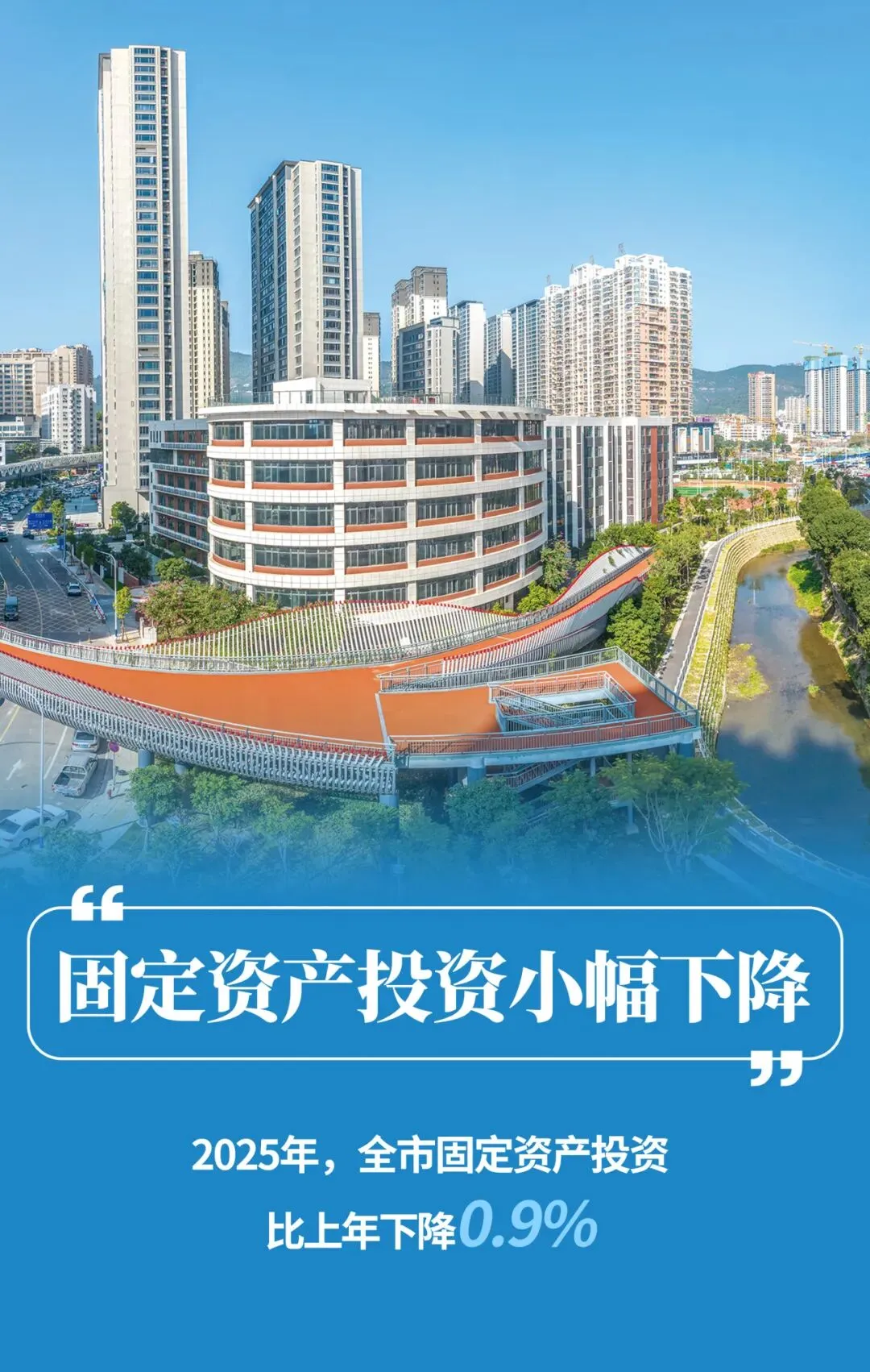 (一)固定资产投资小幅下降,民间投资保持增长。2025年,全市固定资产投资比上年下降0.9%。一是基础设施投资增长较快。基础设施投资增长45.5%,其中市政建设、交通运输等领域投资快速增长,分别增长40.8%、48.5%。二是建安投资持续增长。建安投资增长4.7%,占全部固定资产投资比重为86.1%,拉动固定资产投资增长3.7个百分点。三是民间投资增速回升。民间投资增长2.8%,增幅比上年提高4.4个百分点,其中,扣除房地产开发投资,民间项目投资增长11.7%,增幅比上年提高5.1个百分点。