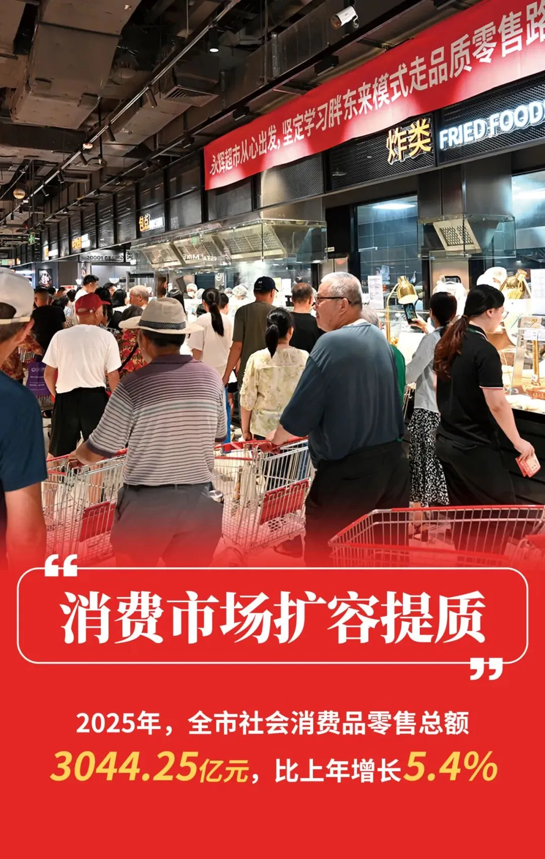 (二)消费市场扩容提质,网络消费持续活跃。2025年,全市社会消费品零售总额3044.25亿元,比上年增长5.4%。一是政策激励效果显著。“以旧换新”等促消费政策有效激发市场活力,带动限额以上通讯器材类、家用电器和音像器材类、新能源汽车等商品零售额快速增长,分别增长89.9%、53.1%、22.9%,共拉动限额以上社会消费品零售额增长2.9个百分点。二是网络零售蓬勃发展。限额以上单位通过公共网络实现商品零售额243.56亿元,增长14.0%,拉动限额以上社会消费品零售额增长7.6个百分点。三是基本生活消费平稳增长。限额以上服装鞋帽针纺织品类、日用品类、粮油食品类等基本生活类商品销售保持平稳增长,分别增长11.7%、8.6%和7.1%,共拉动限额以上社会消费品零售额增长5.1个百分点。