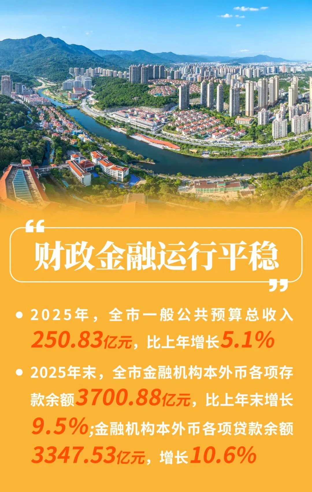 (一)财政金融运行平稳,实体支撑持续加力。2025年,全市一般公共预算总收入250.83亿元,比上年增长5.1%。其中,地方一般公共预算收入170.59亿元,增长8.2%;一般公共预算支出328.92亿元,增长7.7%。2025年末,全市金融机构本外币各项存款余额3700.88亿元,比上年末增长9.5%;金融机构本外币各项贷款余额3347.53亿元,增长10.6%。其中,制造业中长期贷款余额增长11.4%。