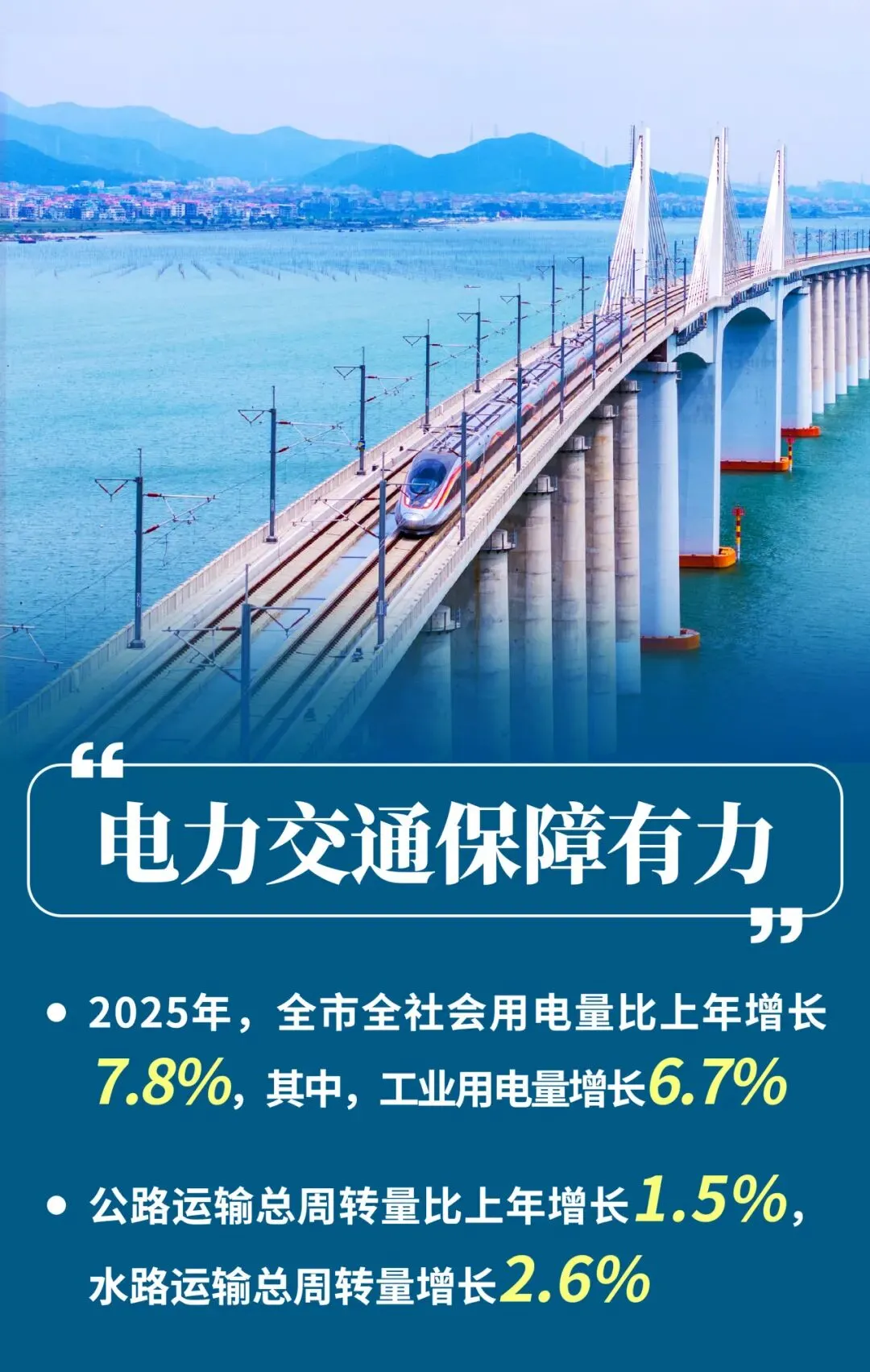 (二)电力交通保障有力,要素供给平稳有序。2025年,全市全社会用电量比上年增长7.8%,其中,工业用电量增长6.7%;全市公路运输总周转量增长1.5%,水路运输总周转量增长2.6%。