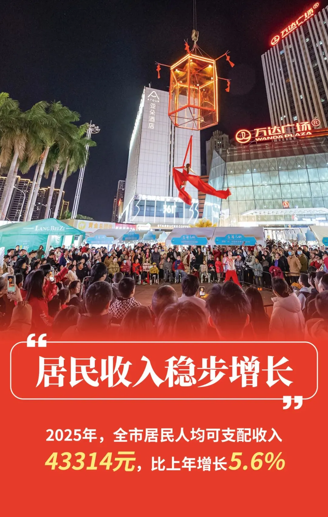 (一)居民收入稳步增长,城乡差距持续缩小。2025年,全市居民人均可支配收入43314元,比上年增长5.6%。其中,城镇居民人均可支配收入53217元,增长5.0%;农村居民人均可支配收入29741元,增长5.9%。城乡居民人均可支配收入之比为1.79,比上年缩小0.01。