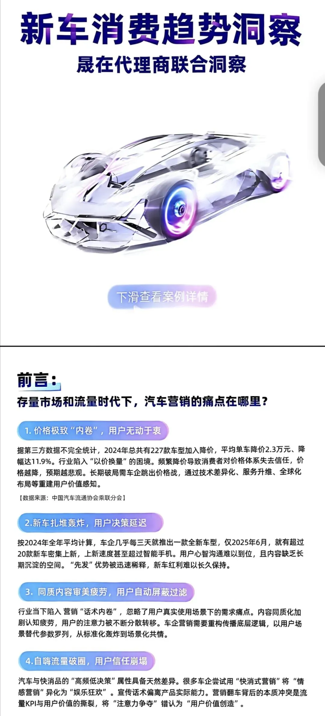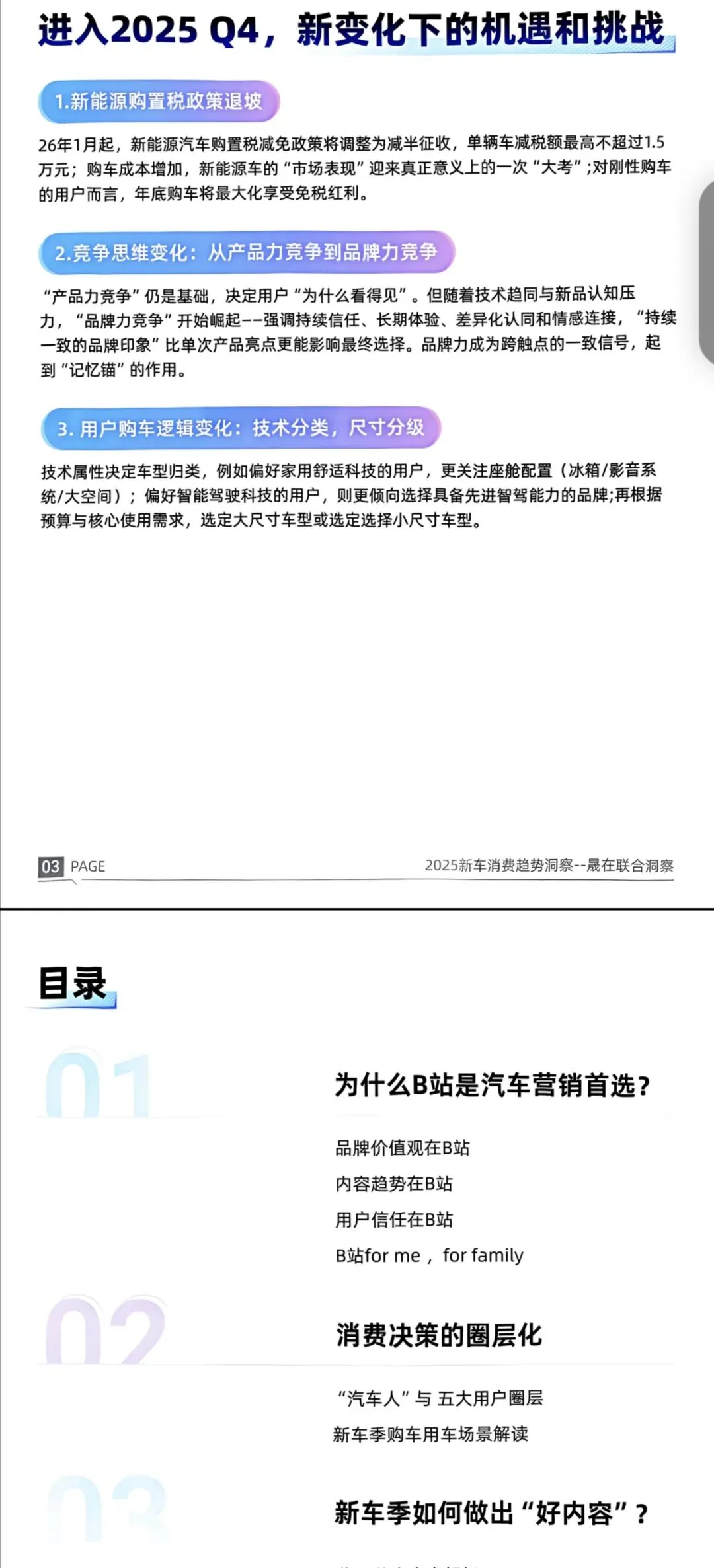 2024年车市陷“以价换量”困境,227款车型平均降价2.3万元仍难打动用户,新车每3天一款致决策延迟,内容同质、快消式营销更让用户信任崩塌。2025Q4迎转折:新能源购置税减半(单辆减税额最高1.5万),竞争从产品力转向品牌力,用户购车按技术(座舱/智驾)与尺寸分级。