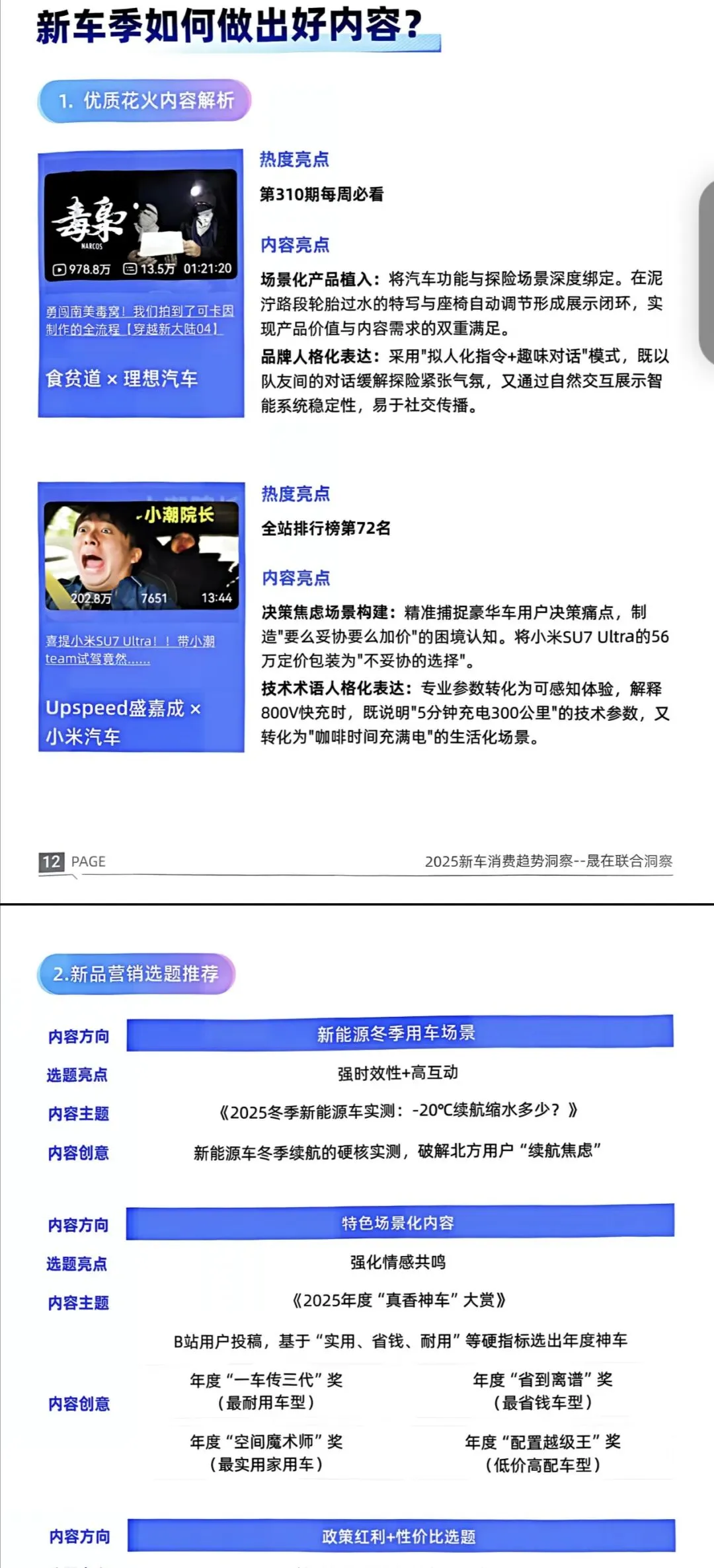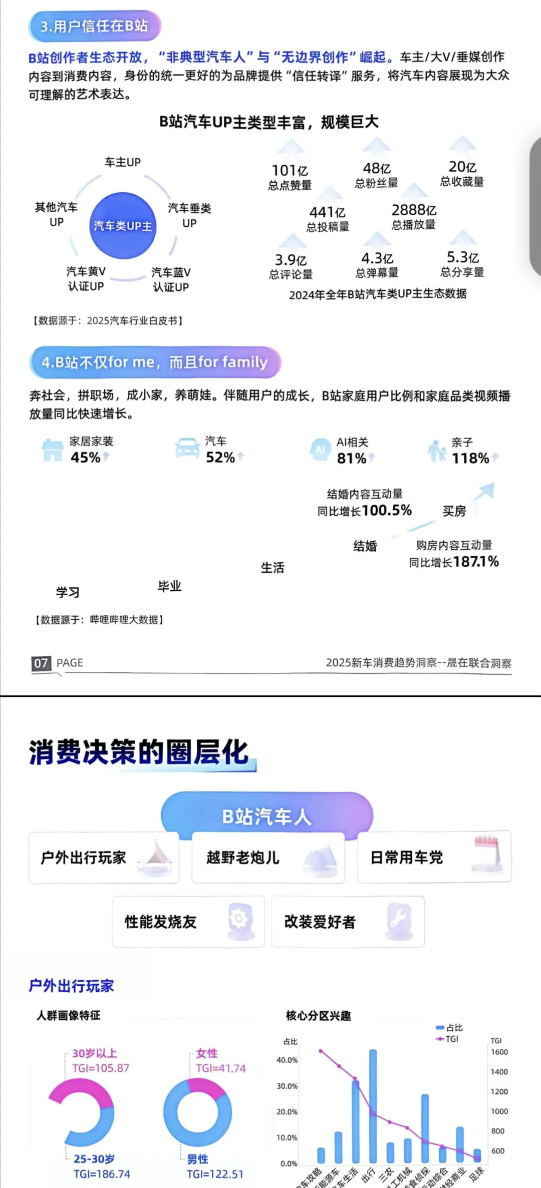 B站成营销首选:长视频+UP主背书实现“一条视频定调”,2024年有8个亿级汽车话题,比亚迪仰望、秦L案例分别实现价值升维与场景共鸣;UP主生态(总播放2888亿)构建信任,家庭用户内容播放量增长显著。此外,五大用户圈层(户外出行玩家等)需求明确,新车季可借场景化植入、政策选题、IP共建打造好内容。