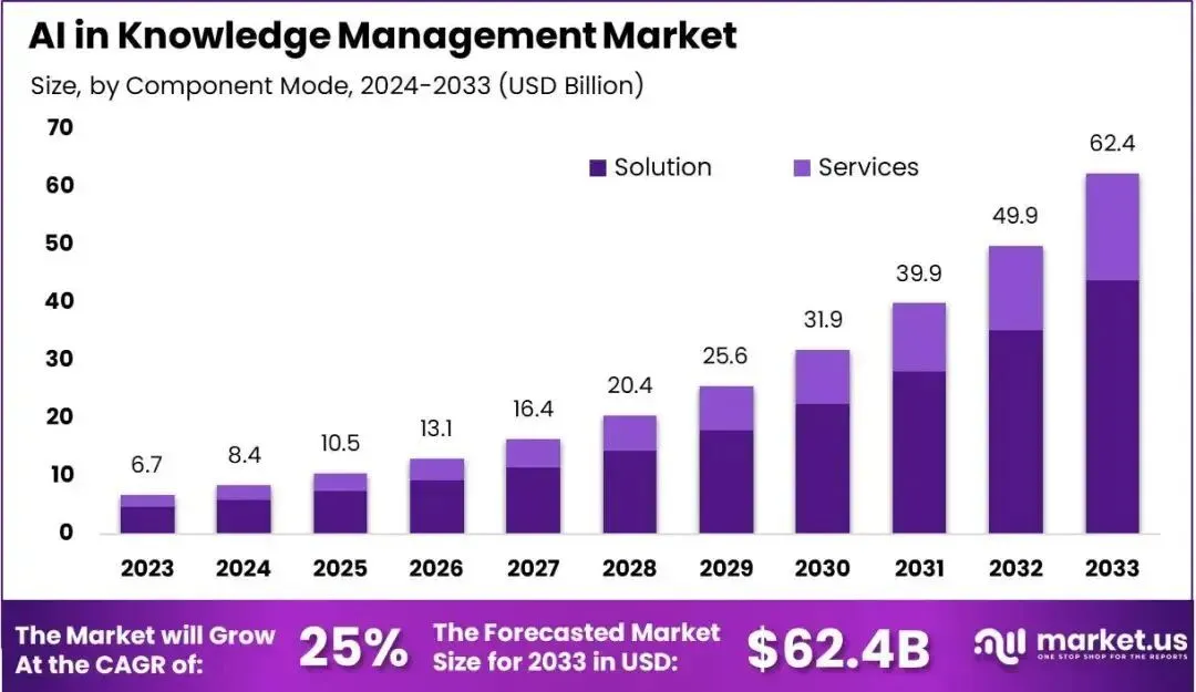 国内市场预期同样强劲。按部分机构测算,2025 年中国企业级知识管理相关市场规模可达约 120 亿元人民币,增速显著高于全球平均;生成式 AI 软件市场中,知识管理/内容生产类工具占据较高比重。
