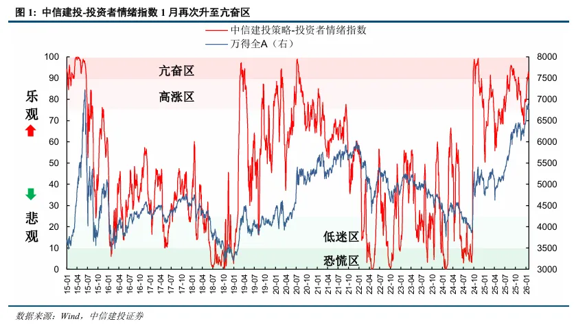情绪指数跟踪结果表明,开年后市场情绪快速升温,从去年末80以下迅速升至月中88以上。“稳字当头”的政策导向虽然抑制了股价的“疯涨”态势,但充沛的增量资金仍然显示投资者情绪的高涨,万得全A指数也维持高位,到1月20日情绪指数再次突破90进入亢奋区,之后基本在90-93区间窄幅震荡,体现了市场“加速冲顶”的内在冲动和监管“主动降温”之间的拉锯态势。1月30日,由于国际贵金属价格剧烈波动和A股宽基ETF近期大规模的抛售导致的流动性压力,情绪指数出现明显下滑,发出右侧卖出信号且面临跌出亢奋区考验。考虑到春节前避险情绪升温,情绪指数回落的季节性效应,我们预计市场短期面临情绪降温和指数回调压力。综合考虑当前市场增量资金和情绪指数各分项指标,我们预计全A指数调整空间有限,且有望在春节前企稳,春节前后迎来新一轮上行行情。