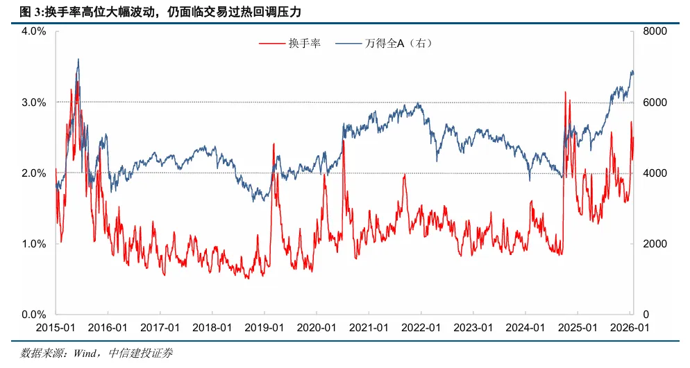 换手率:高位大幅波动,仍面临交易过热回调压力。1月市场量能快速放大且剧烈波动,换手率很快突破了2%警戒线进入交易过热状态,月中一度突破2.7%。近期换手率仍然大幅波动,月末接近2.5%,显示当前交易仍然过热,指数面临回调压力。