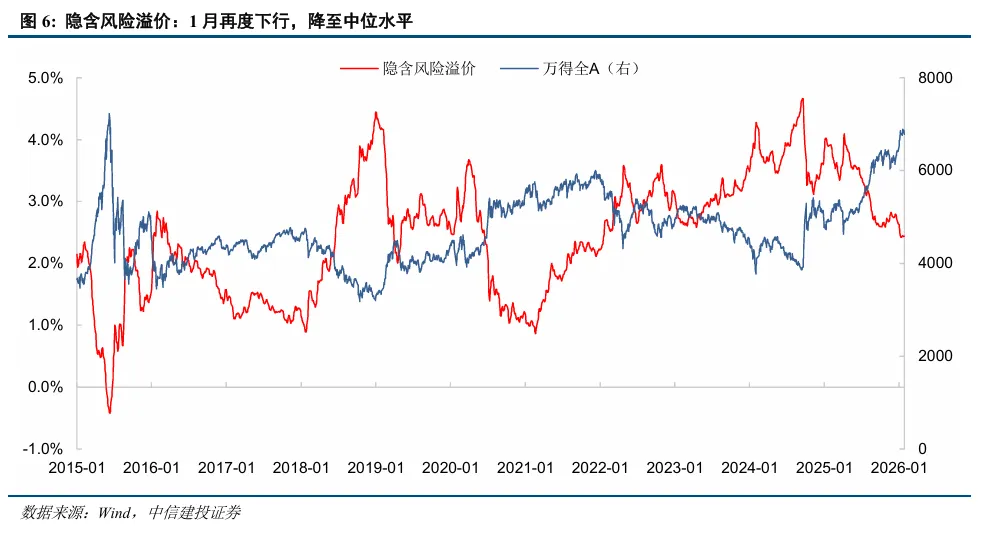 隐含风险溢价:1月再度下行,降至中位水平。1月该指标延续上月的回落趋势,下旬有所企稳,稳定在2.45%附近为2015年以来中位水平,也是2022年以来最低水平,这表明权益资产性价比已经有所下降。