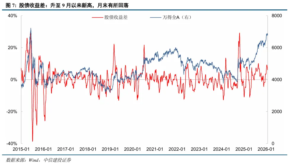 股债收益差:升至9月以来新高,月末有所回落。反映投资者短期赚钱效应的股债收益差指标1月大幅飙升,月中升至9月以来新高,月末有所回落,预计2月初仍将延续下行趋势,对情绪指数造成拖累。
