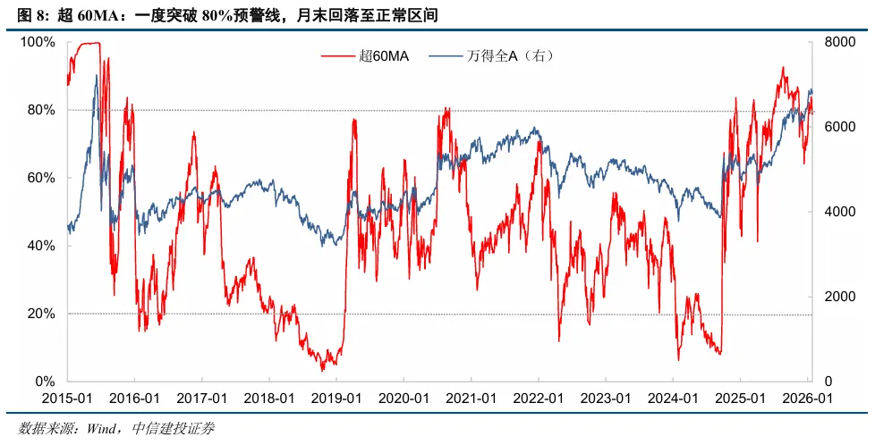超60MA:一度突破80%预警线,月末回落至正常区间。该指标以中长期视角刻画市场强弱状况,反映市场上收盘价在60周均线(300日均线)上方的个股比例。从历史上看该指标超过80%/低于20%往往意味着市场情绪的过热/过冷,行情有出现反转的可能。1月在充沛的增量资金推动下,指标一度突破80%预警线接近84%,月末资金面重回存量博弈,指标回落至80%以下的正常区间。