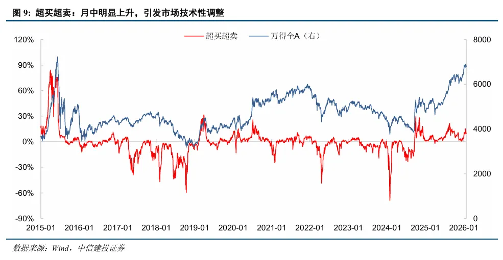 超买超卖:月中明显上升,引发市场技术性调整。该指标以短期视角刻画市场强弱情况,去年5月以来该指标持续处于零轴上方,显示市场短期整体持续强势期。1月该指标明显上升,在(12日)突破10%和(23日)突破15%后引发市场技术性调整,但调整幅度有限。月末该指标已经重回10%下方,后续调整压力仍然有限。