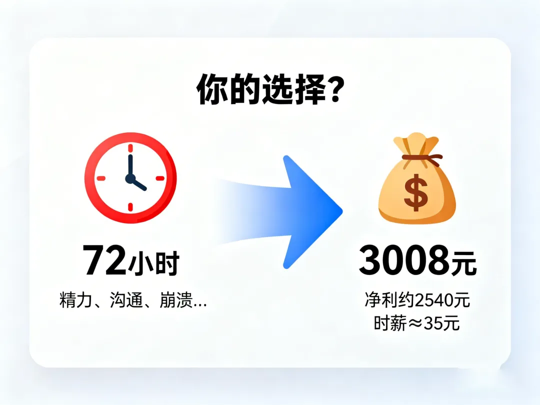 换算成一个扎心的数字:时薪 ≈ 41.7元 【(3008 - 467.3) / 72 ≈ 35.3元,若算净收入;若算毛收入则约41.7元】。这还没算我为此焦虑、失眠、牺牲休息时间的“精神损耗费”。