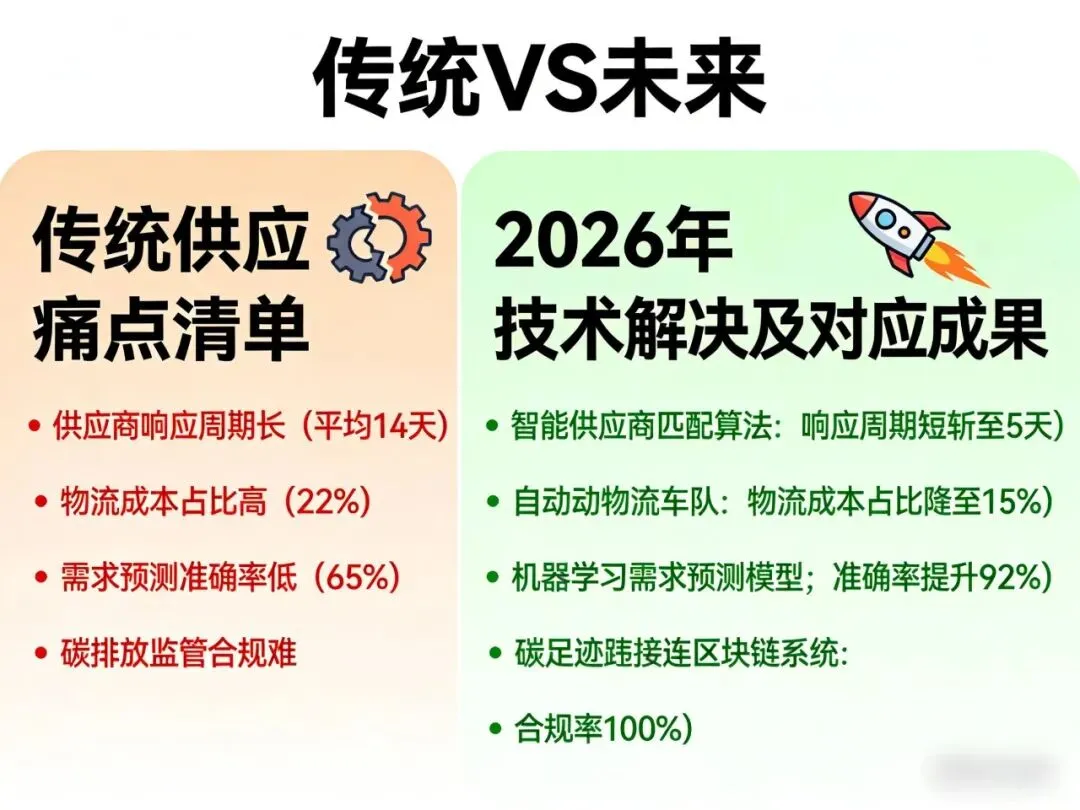 AI预测降低库存与采购成本,区块链提升物流与融资效率,柔性制造缩短交付周期,绿色转型开辟新价值空间。综合来看,2026年落地技术融合方案的企业,平均物流效率提升35%,库存周转率提高20%-25%,生产环节成本降低18%-42%,核心指标全面优于传统模式。
