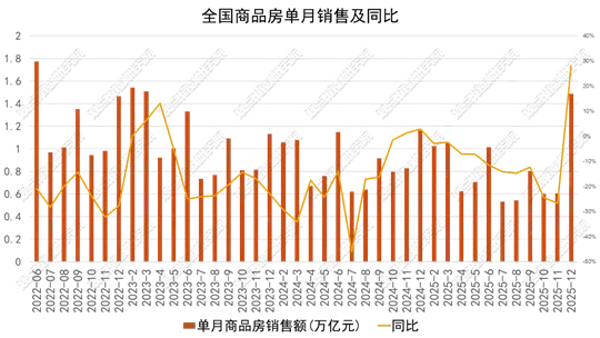 根据国家统计局发布的数据显示,2025年1-12月份,新建商品房销售面积88101万平方米,新建商品房销售额83937亿元。12月份单月销售额为14867亿元,同比增长27.88%。呈现显著的年末“翘尾”效应,与年末房企冲刺业绩及政策支持带动需求集中释放有关。