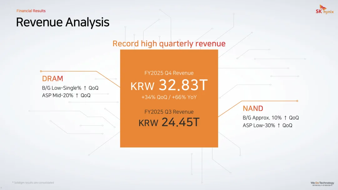 在 DRAM 领域,虽然通用型内存(如 PC 和手机端)需求平稳,但在高单价产品的拉动下,整体表现依然强劲。随着 HBM3E 和服务器用 DDR5 的出货比重不断攀升,DRAM 的混合平均售价环比上涨了 20% 中段。SK海力士正通过调整产品组合,将产能优先分配给利润最丰厚的 AI 产线,从而实现了营收质量的飞跃。