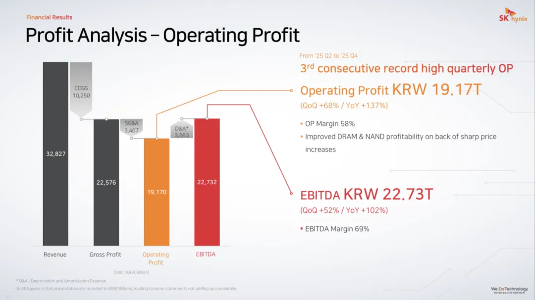 更为引人注目的是其盈利能力的质变。单季营业利润达到 19.17 万亿韩元,同比暴增 137%。这意味着,公司本季度的 营业利润率高达 58%,若计入折旧摊销前的 EBITDA 利润率更是达到了 69%。这一数据表明,受益于 HBM(高带宽内存)和企业级 SSD 等高溢价产品的出货占比提升,SK海力士已暂时脱离了传统存储周期的引力,进入了由卖方主导的“超级盈利周期”。