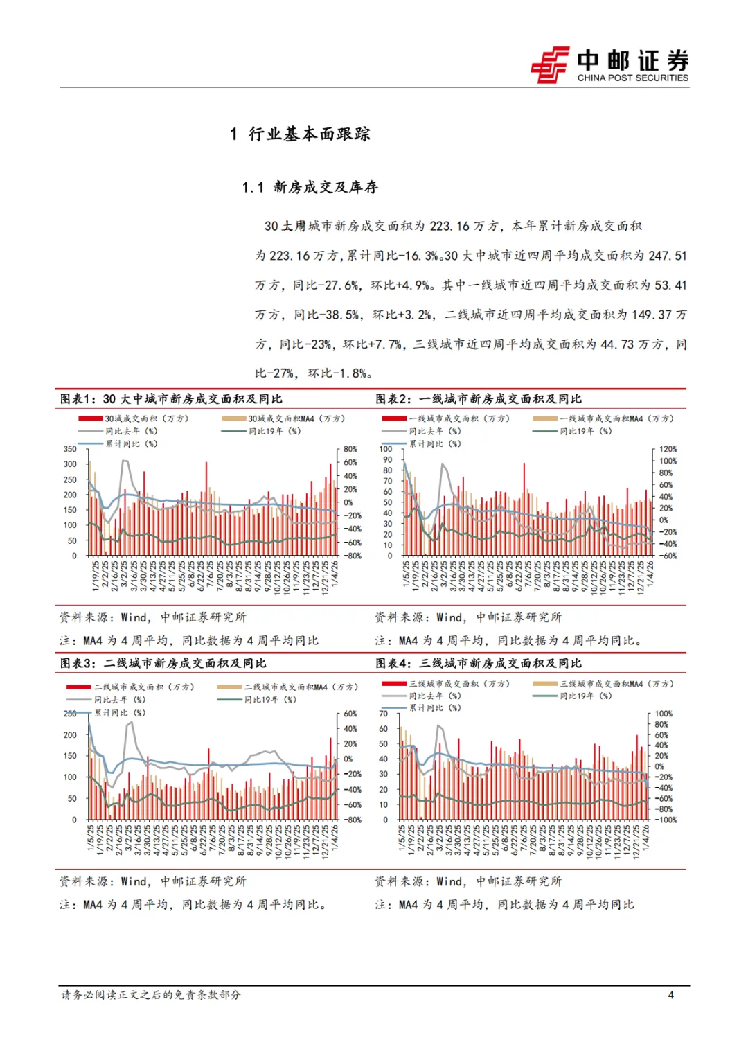 (1)新房成交及库存:上周 30 大中城市新房成交面积为 223.16万方,本年累计新房成交面积为 223.16 万方,累计同比-16.3%。30大中城市近四周平均成交面积为 247.51 万方,同比-27.6%,环比+4.9%。其中一线城市近四周平均成交面积为53.41万方,同比-38.5%,环比+3.2%,二线城市近四周平均成交面积为 149.37 万方,同比-23%,环比+7.7%,三线城市近四周平均成交面积为 44.73 万方,同比-27%,环比-1.8%。上周 14 城商品住宅可售面积为 7967.2 万方,同比-5.45%,环比-1.13%,14 城去化周期为 20.09 个月,其中一线城市去化周期为14.33 个月。