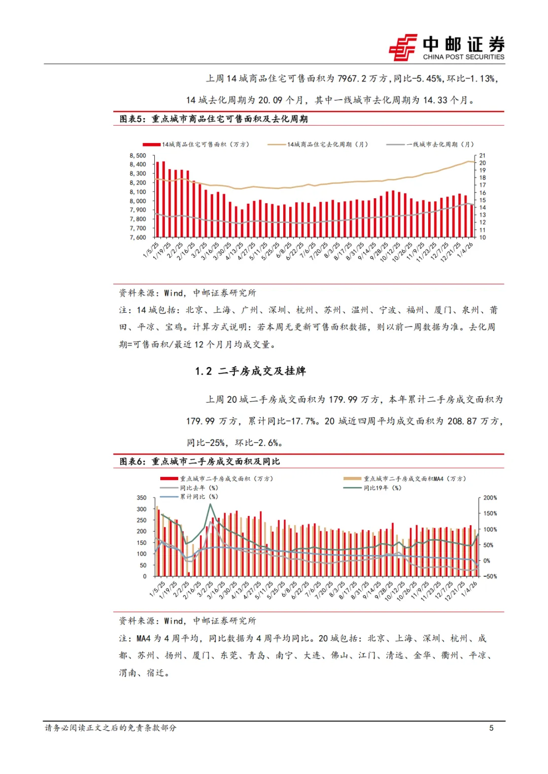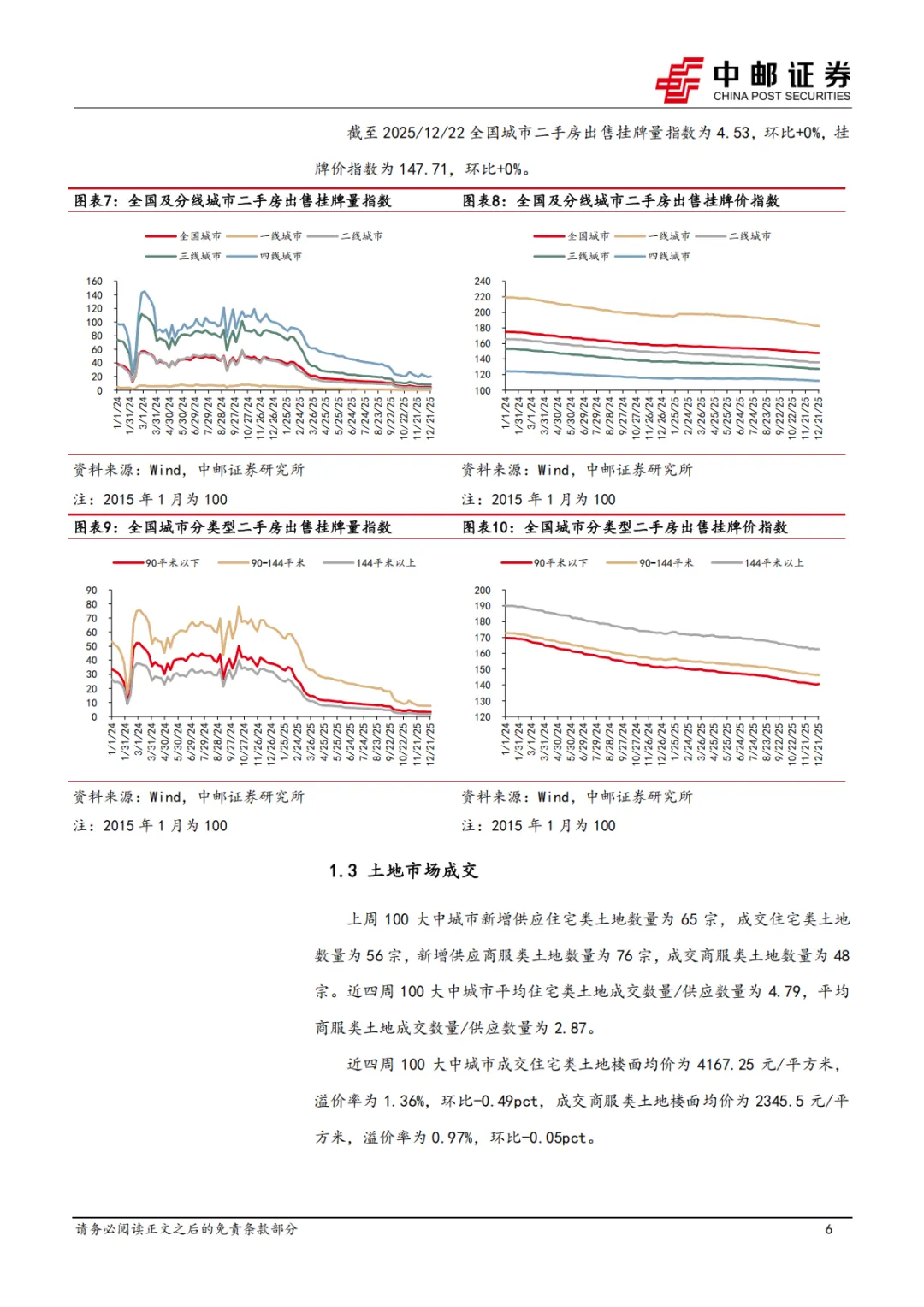 (2)二手房成交及挂牌:上周 20 城二手房成交面积为 179.99 万方,本年累计二手房成交面积为 179.99 万方,累计同比-17.7%。20城近四周平均成交面积为 208.87 万方,同比-25%,环比-2.6%。截至2025/12/22 全国城市二手房出售挂牌量指数为 4.53,环比+0%,挂牌价指数为 147.71,环比+0%。