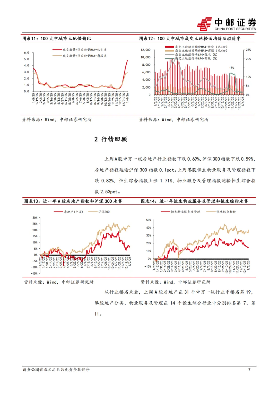 根据中指院数据,2025 年 TOP100 房企权益销售总额约 25209 亿元,24 年全年约为 30887 亿元,百强房企 25 年权益销售总额同比下滑-18.4%。2025 年 TOP100 房企拿地总额 9640 亿元,同比增长 3.9%,央企拿地保持积极。求是网文章《改善和稳定房地产市场预期》明确提出"政策要一次性给足,不能采取添油战术",并强调房地产"显著的金融资产属性",标志着政策思路从分散调控转向系统性发力,我们认为 2026 年地产市场企稳值得期待。