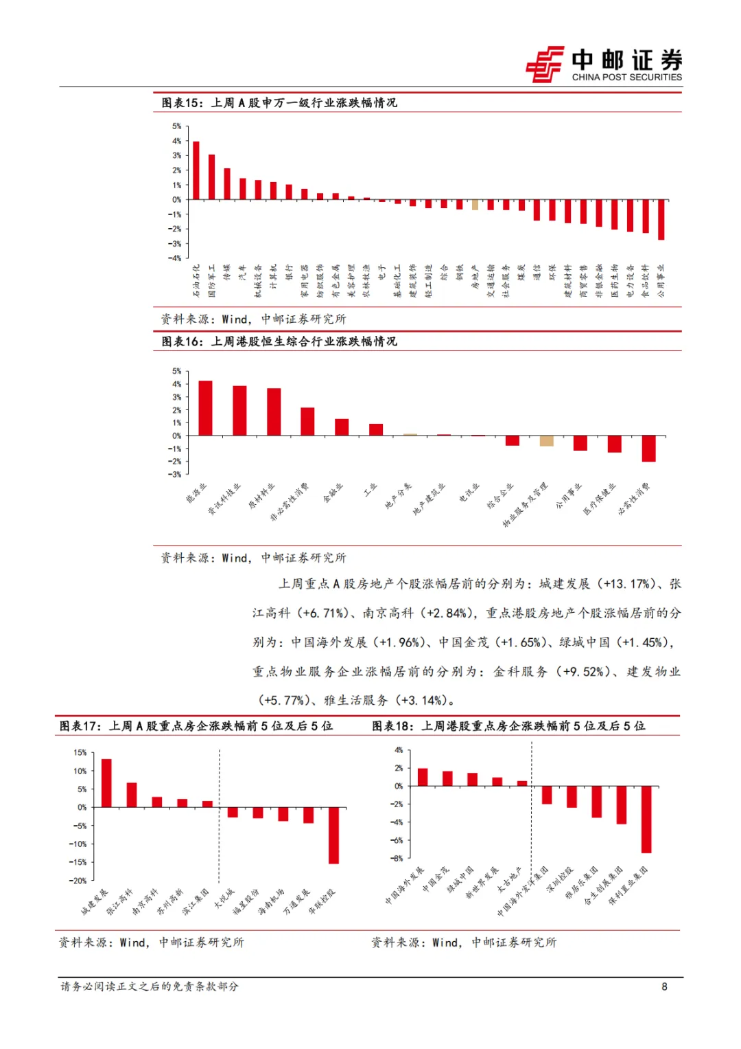 上周 A 股申万一级房地产行业指数下跌 0.69%,沪深 300 指数下跌 0.59%,房地产指数跑输沪深 300 指数 0.1pct。上周港股恒生物业服务及管理指数下跌 0.82%,恒生综合指数上涨 1.71%,物业服务及管理指数跑输恒生综合指数 2.53pct。
