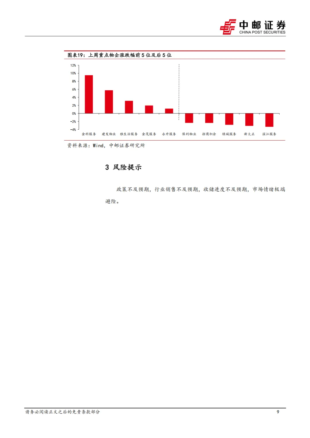 (3)土地市场成交:上周 100 大中城市新增供应住宅类土地数量为 65 宗,成交住宅类土地数量为 56 宗,新增供应商服类土地数量为 76 宗,成交商服类土地数量为 48 宗。近四周 100 大中城市平均住宅类土地成交数量/供应数量为 4.79,平均商服类土地成交数量/供应数量为 2.87。近四周 100 大中城市成交住宅类土地楼面均价为4167.25 元/平方米,溢价率为 1.36%,环比-0.49pct,成交商服类土地楼面均价为 2345.5 元/平方米,溢价率为 0.97%,环比-0.05pct。