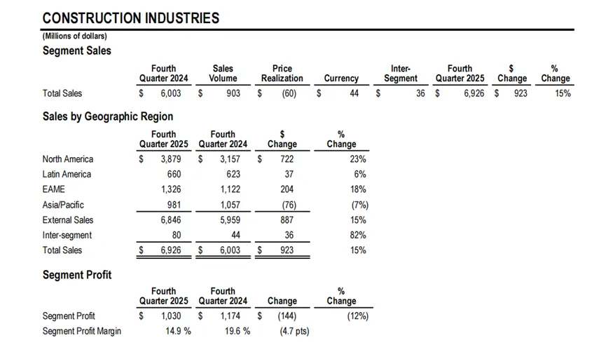 2025Q4,卡特彼勒RI板块,北美区域:销售额同比增长32%,增长显著。