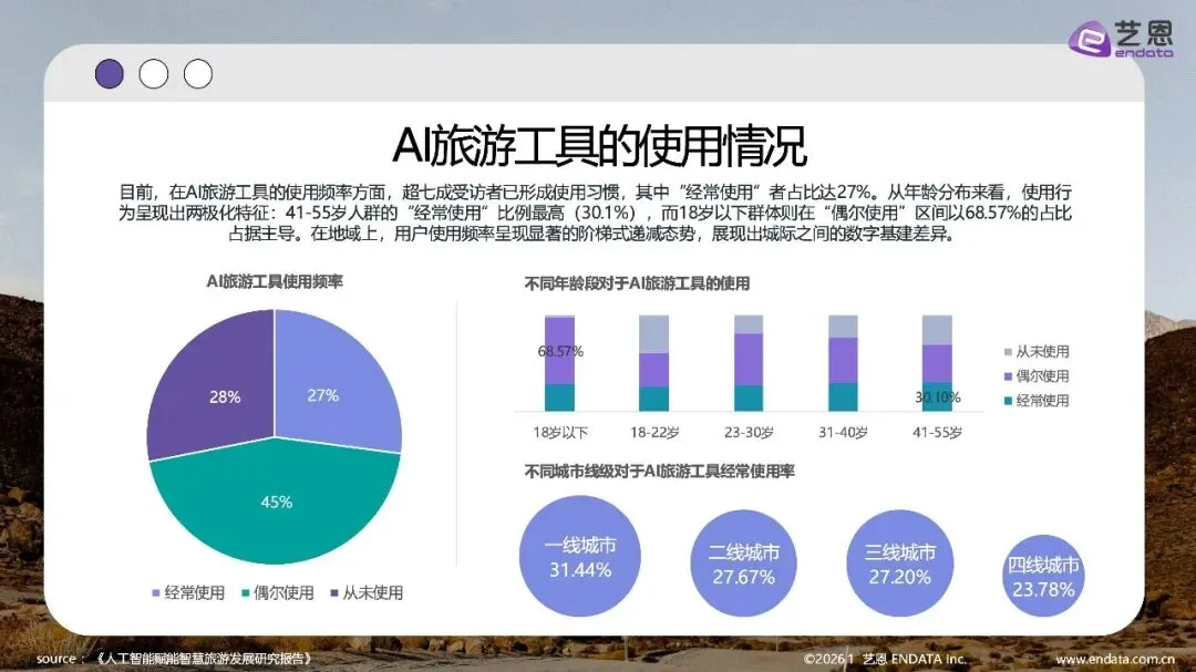 先看最直观的游客端,数据不会说谎:超七成受访者已养成用AI旅游工具的习惯,27%的人经常用(来源:《人工智能赋能智慧旅游发展研究报告》)。但有意思的是,使用偏好藏着明显分层。
