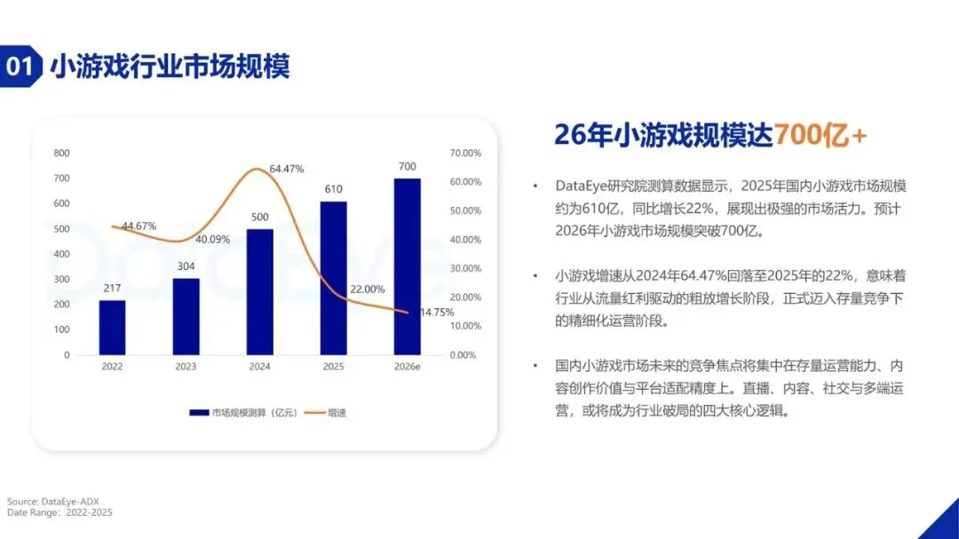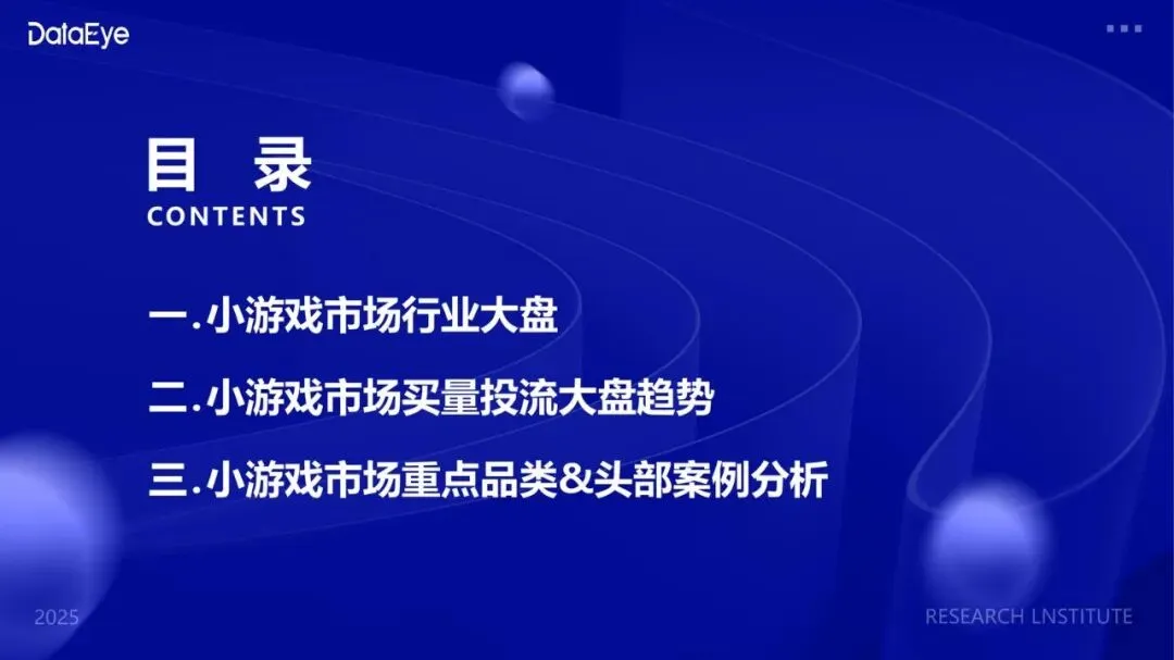 DataEye研究院发布的《2025年度小游戏买量数据报告》全面剖析了国内小游戏市场的行业规模、用户行为、买量投流趋势以及重点品类竞争格局。报告显示,小游戏市场正从高速增长阶段迈入存量竞争与精细化运营并行的新阶段,买量投流市场也呈现出结构性转移,小游戏已成为流量竞争的新主场。