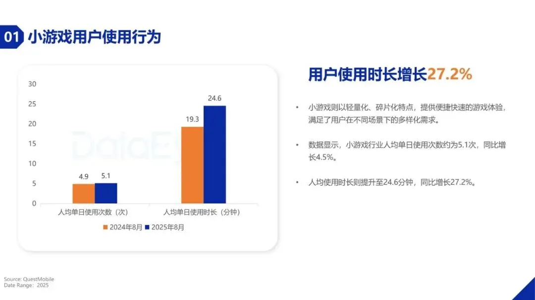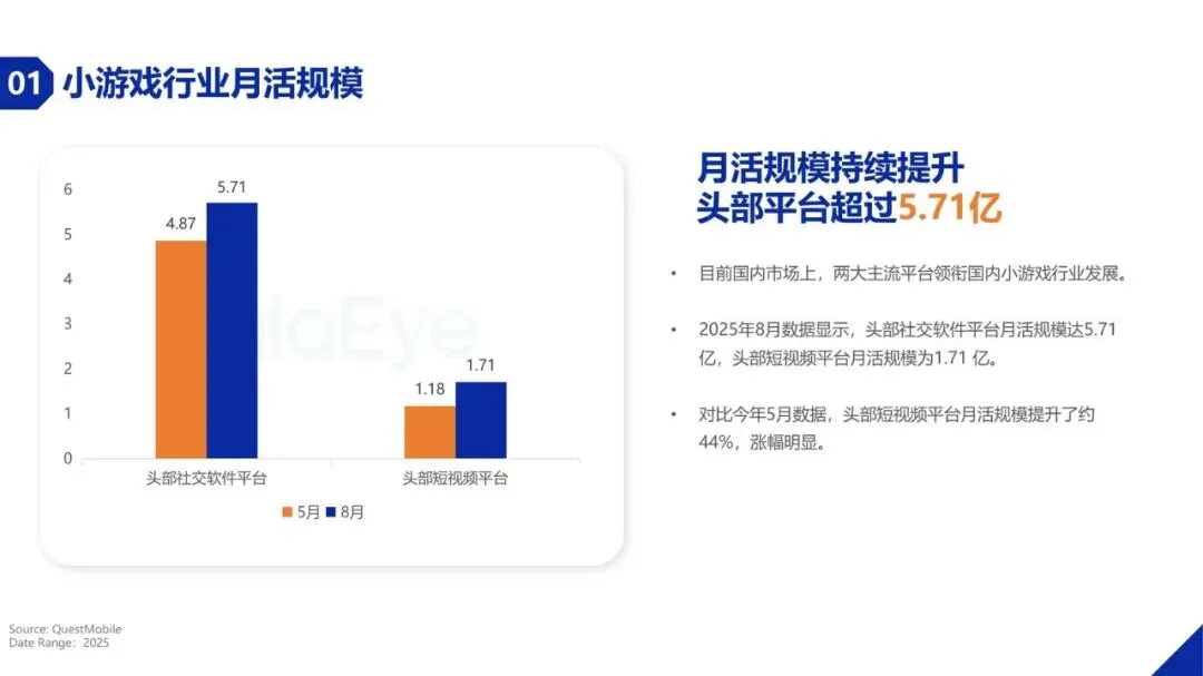 2025年国内小游戏市场规模预计达到610亿元,同比增长22%,展现出强劲的市场活力。预计2026年市场规模将突破700亿元。尽管增速较2024年的高位有所回落,但这标志着行业从依赖流量红利的粗放增长,正式转向存量竞争下的精细化运营。用户层面,头部社交软件平台月活用户规模已达5.71亿,头部短视频平台月活用户为1.71亿,且后者增长迅速。小游戏以其轻量化、碎片化特点,用户人均单日使用时长提升至24.6分钟,同比增长27.2%,满足了用户多样化的场景需求。