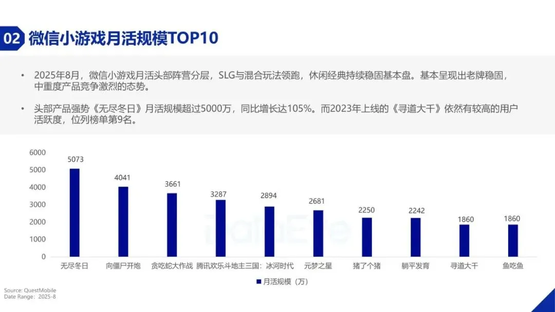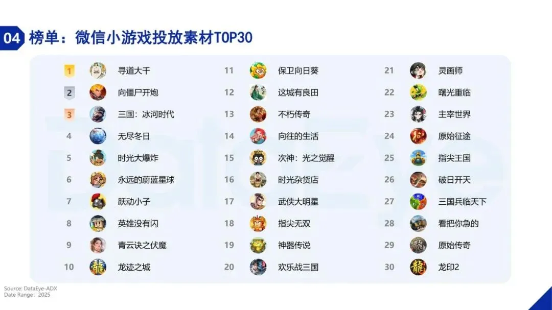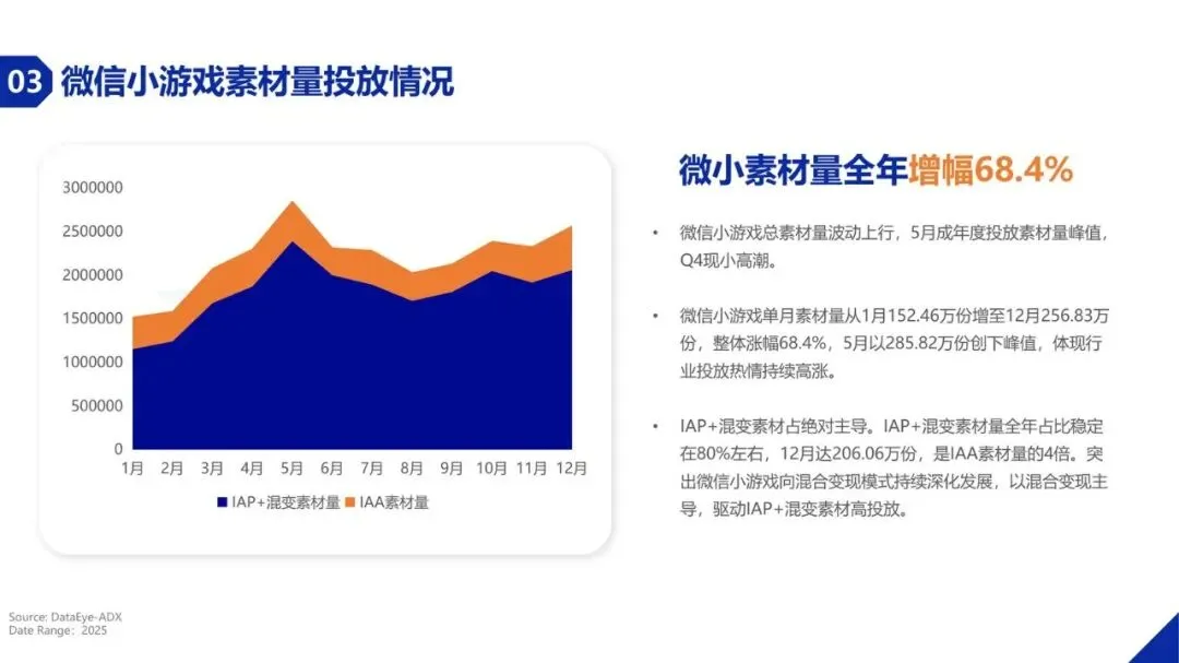 报告深入分析了小游戏市场的品类格局。在投产品题材方面,现代题材产品数暴增52.23%,成为绝对主流;魔幻、末日等中重度题材也保持增长。然而,在买量素材投入上,传奇、魔幻、仙侠、三国等中重度题材占据主导地位,合计占比超过70%,显示出买量市场向中重度化转型的明显趋势。玩法方面,休闲类游戏是流量基本盘,但消除类玩法以超过91%的同比增幅成为增长冠军。在投放素材TOP500产品中,MMORPG、放置、卡牌三大玩法合计占比高达70.6%,市场集中度进一步提升,头部厂商凭借研运能力和IP资源占据优势。