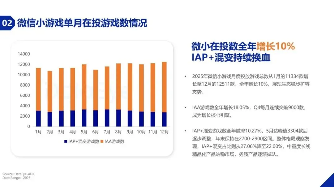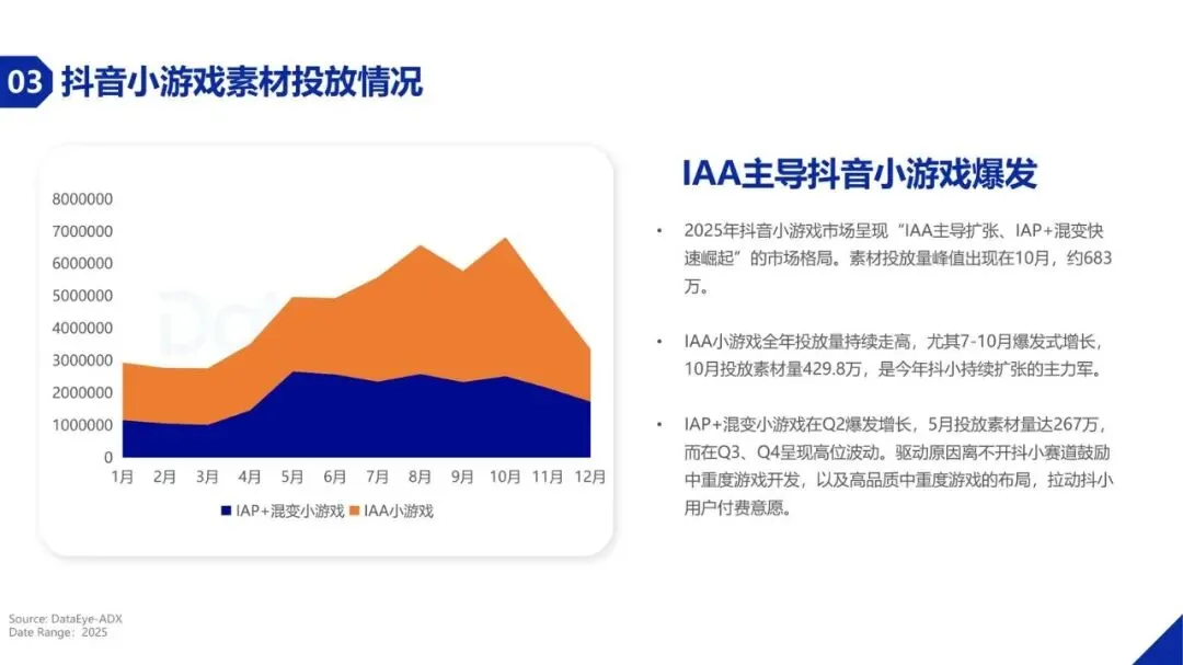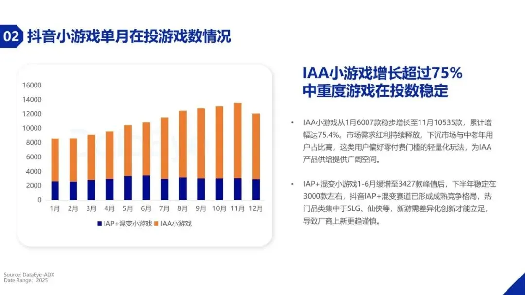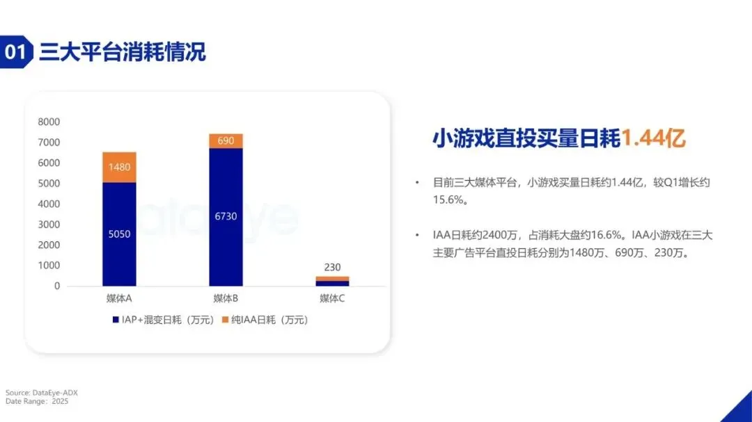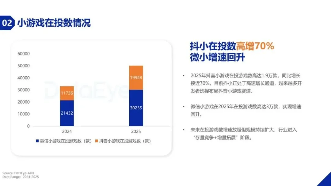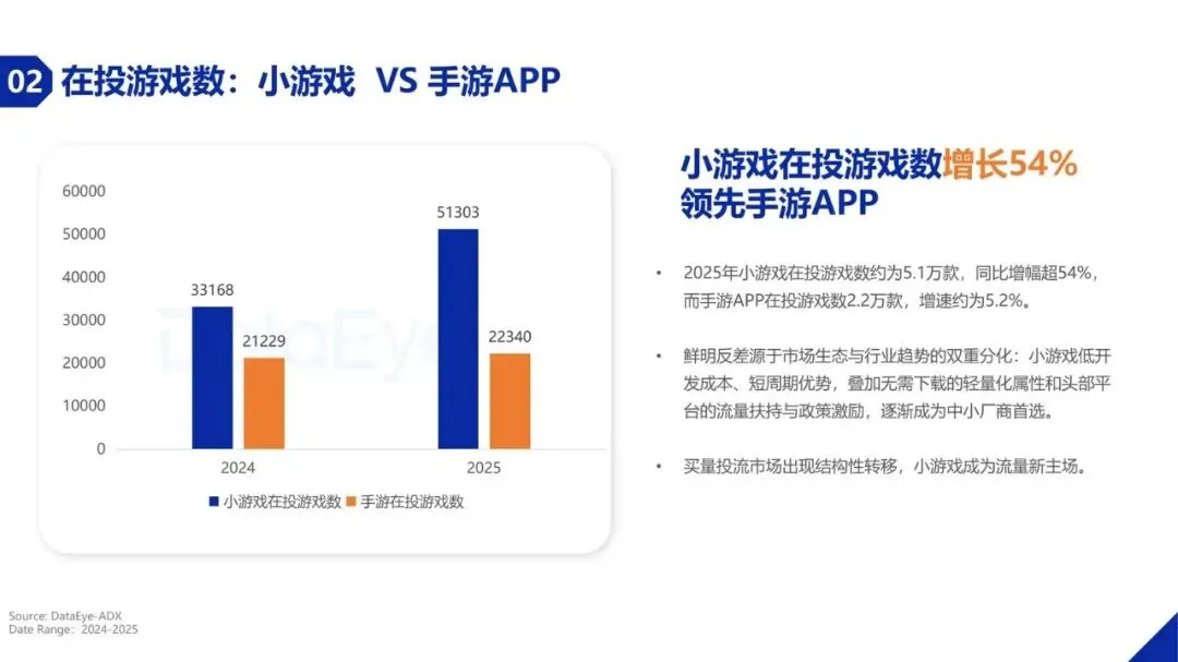 买量投流市场正发生深刻变化。2025年,小游戏在三大主要广告平台的直投日消耗总额约1.44亿元,较第一季度增长约15.6%。更显著的变化体现在产品数量上,小游戏在投游戏数达到约5.1万款,同比增幅超过54%,远超手游APP的增速。这主要得益于小游戏开发成本低、周期短、无需下载的轻量化特性,以及头部平台的流量扶持,使其成为众多开发者的首选。其中,抖音小游戏在投游戏数同比增长接近70%,微信小游戏在投游戏数也超过3万款,市场持续扩容。