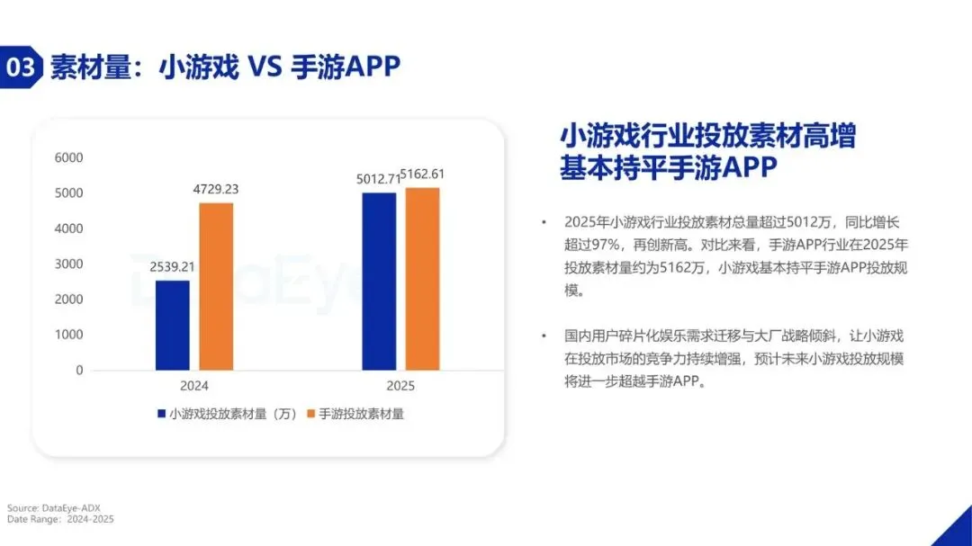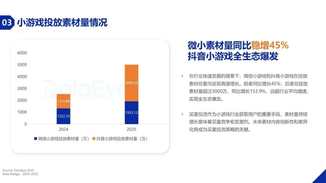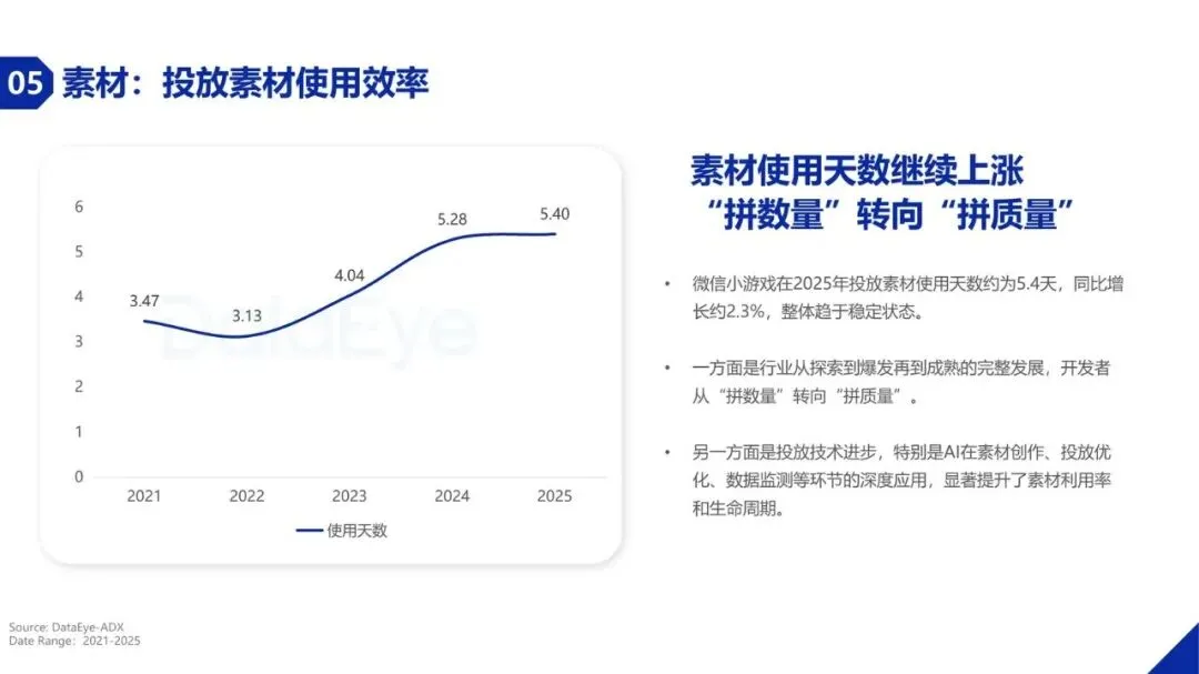 激烈的市场竞争直接反映在素材投放量上。2025年小游戏行业投放素材总量超过5012万,同比增长超过97%,已基本与手游APP的投放规模持平。分平台看,抖音小游戏投放素材量超过3000万,同比激增153.9%,实现全生态爆发;微信小游戏投放素材量也同比增长45%。素材使用天数持续上涨至约5.4天,表明行业正从“拼数量”转向“拼质量”。同时,AI创意素材快速崛起,占比已接近5%,成为降低制作成本、提升投放效率的重要工具。