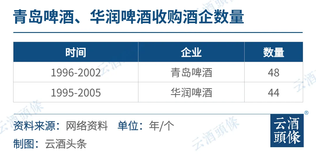 数据显示,青岛啤酒、华润啤酒在1995-2005年间都有收购啤酒工厂。