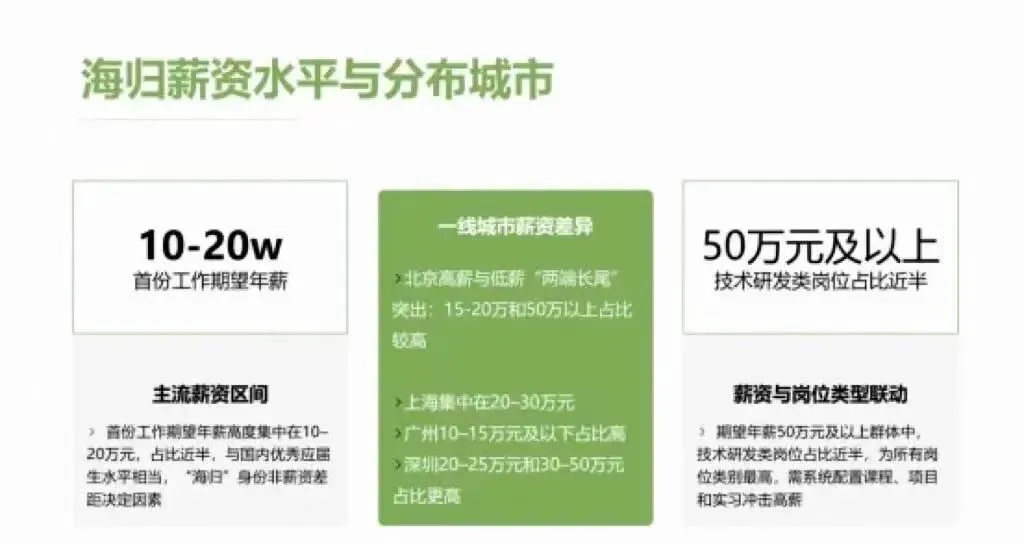 数据显示,海归起薪多集中在10-20万元区间,与国内优秀应届生基本持平,“海归光环”逐步消退;其就业行业主要集中在互联网/科技、金融及专业服务等领域,其次是制造与硬科技领域及出海企业。