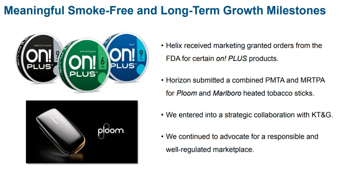 在电子烟行业,监管政策的影响力远超想象。2025 年,奥驰亚旗下 Helix 公司的 on! PLUS 系列产品获得了美国 FDA 的营销授权,这为其产品在合规市场的推广铺平了道路;同时,奥驰亚与 JT 集团的合资公司 Horizon 也提交了 Ploom 和万宝路加热烟草棒的 PMTA(上市前烟草产品申请)和 MRTPA(改良风险烟草产品申请)组合申请。