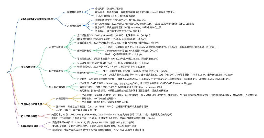 就在这样的行业背景下,全球烟草巨头奥驰亚集团(Altria)发布了 2025 年第四季度及全年财报。这份财报不仅展现了奥驰亚自身的经营状况,更像一面镜子,折射出整个电子烟行业的现状与未来趋势。对于新型烟草和电子烟公司,读懂这份财报,或许就能找到在行业变局中破局的关键。
