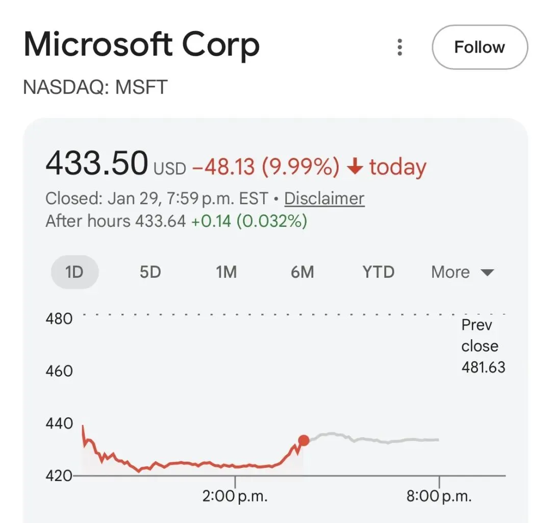 然而冰火两重天,同时发布财报的微软则走出了完全相反的走势。微软财报次日创下自2020年以来的最大单日市值跌幅,曾一度下跌12%。主要原因在于: