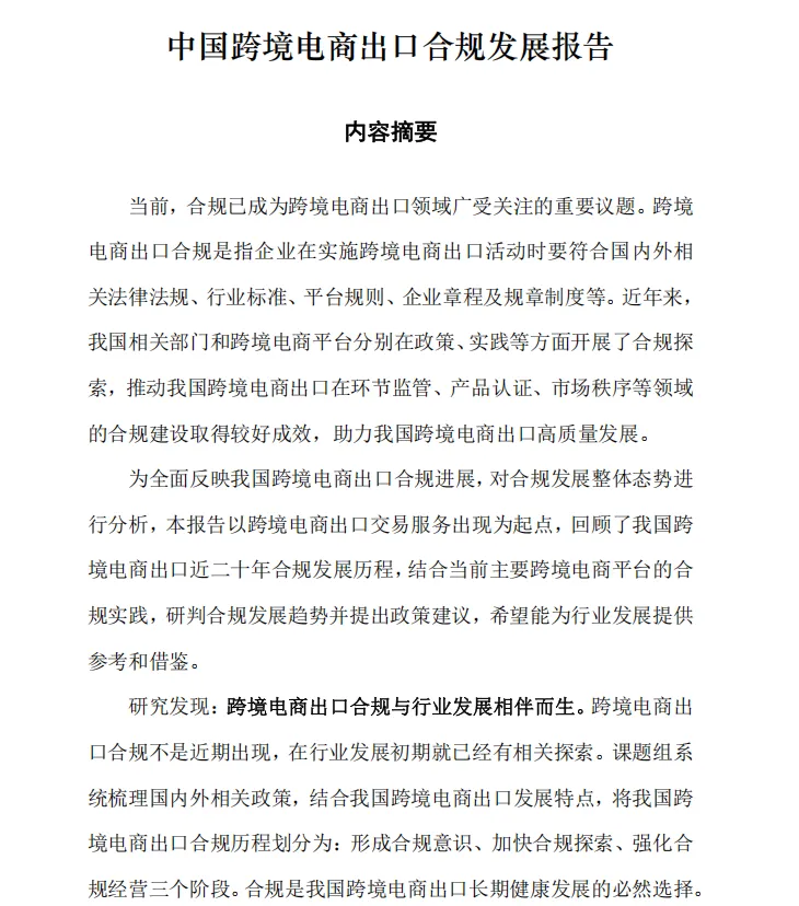 《中国跨境电商出口合规发展报告》指出,合规已成为跨境电商出口核心议题,覆盖知识产权、产品安全、市场秩序等关键领域。报告梳理合规发展三阶段,预判专业化、绿色化等趋势,给出全流程合规建议。