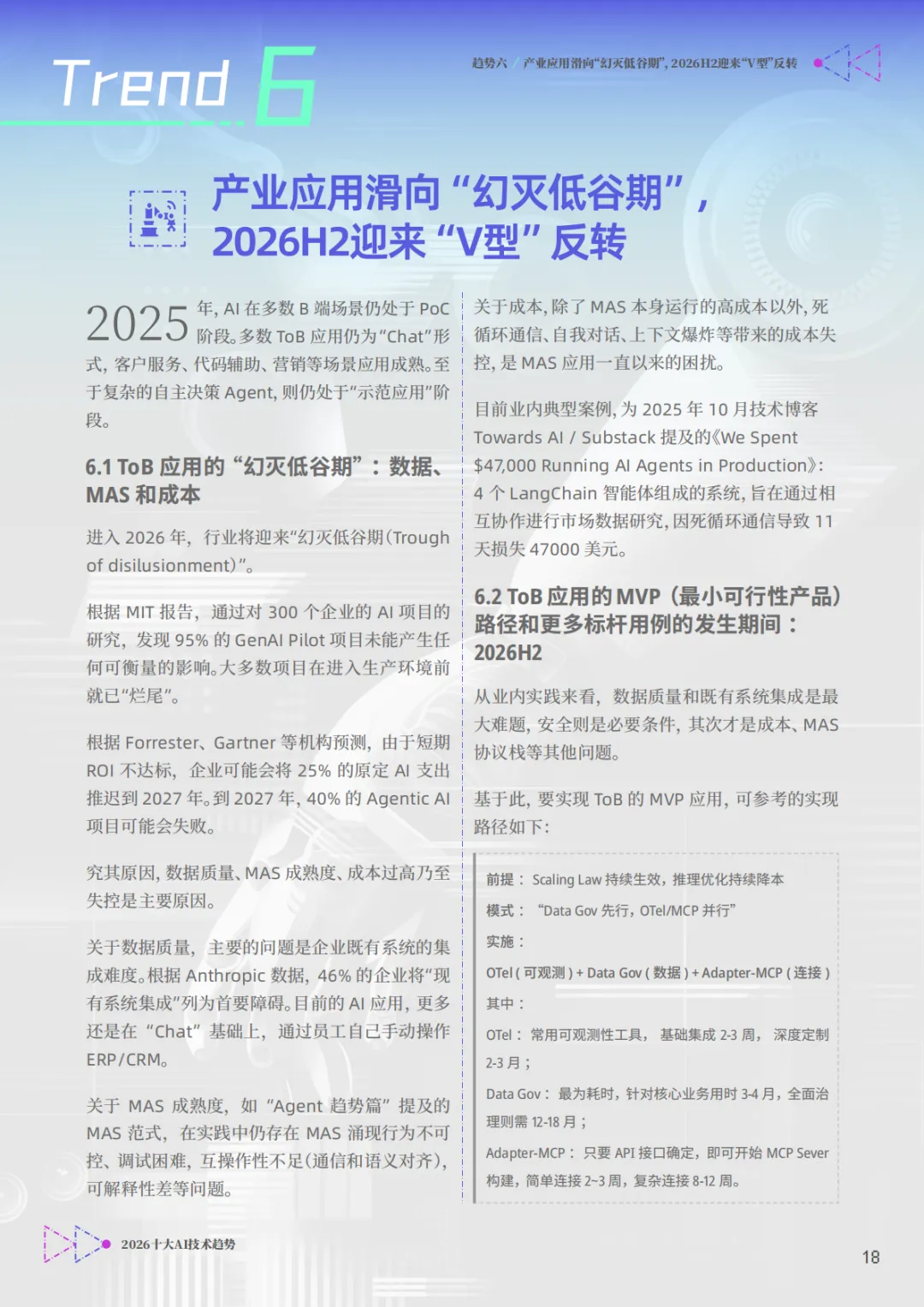 报告直言,2026年企业级AI应用将进入“幻灭低谷期”。高达95%的试点项目未能产生可衡量的商业影响,失败主因在于数据孤岛、多智能体系统不稳定、成本失控。