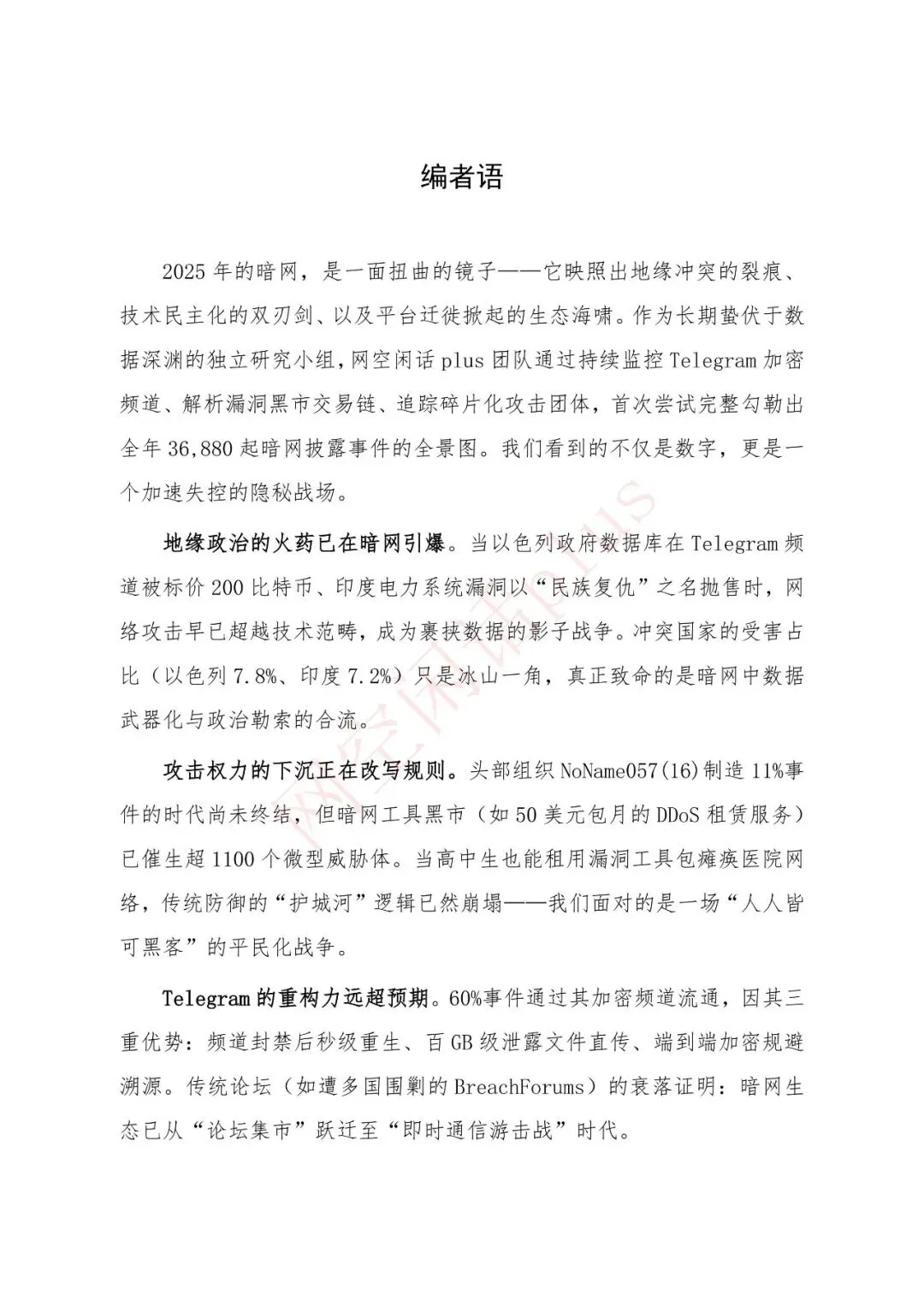 本号荣幸地宣布,《2025年暗网情报态势观察》报告现已正式发布。本报告通过对全球暗网活动的全面监测与分析,揭示了当前暗网情报对抗领域的最新趋势与挑战。报告共分为十章,涵盖65页详实内容。