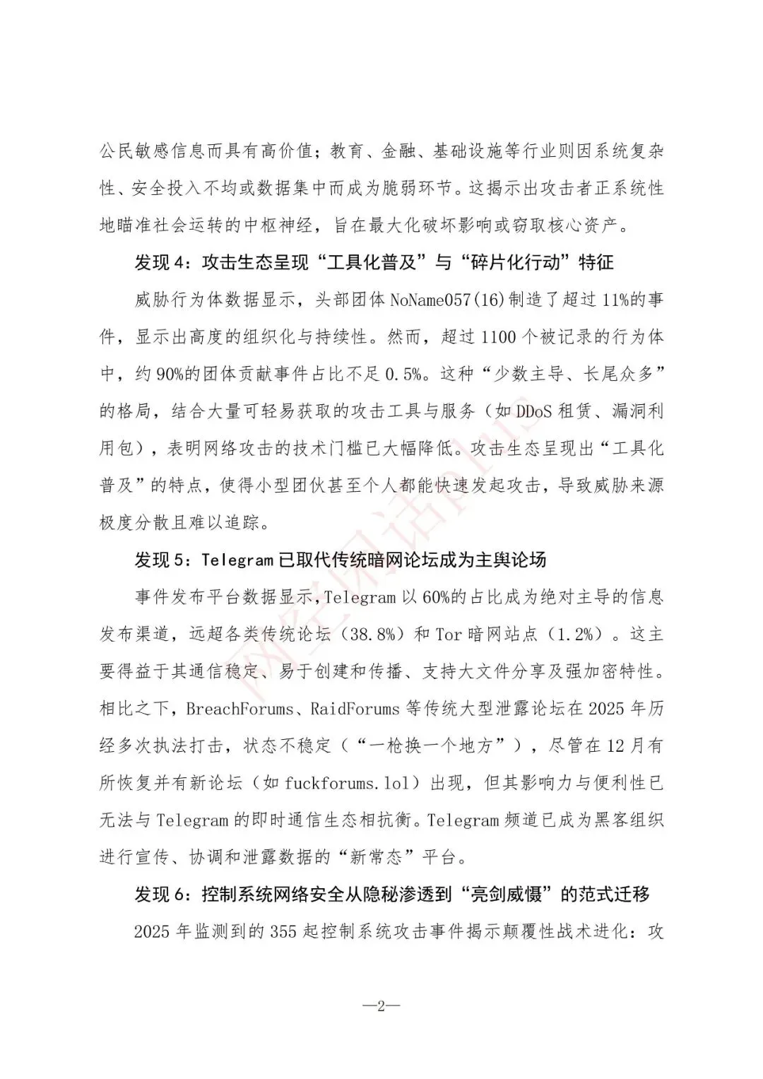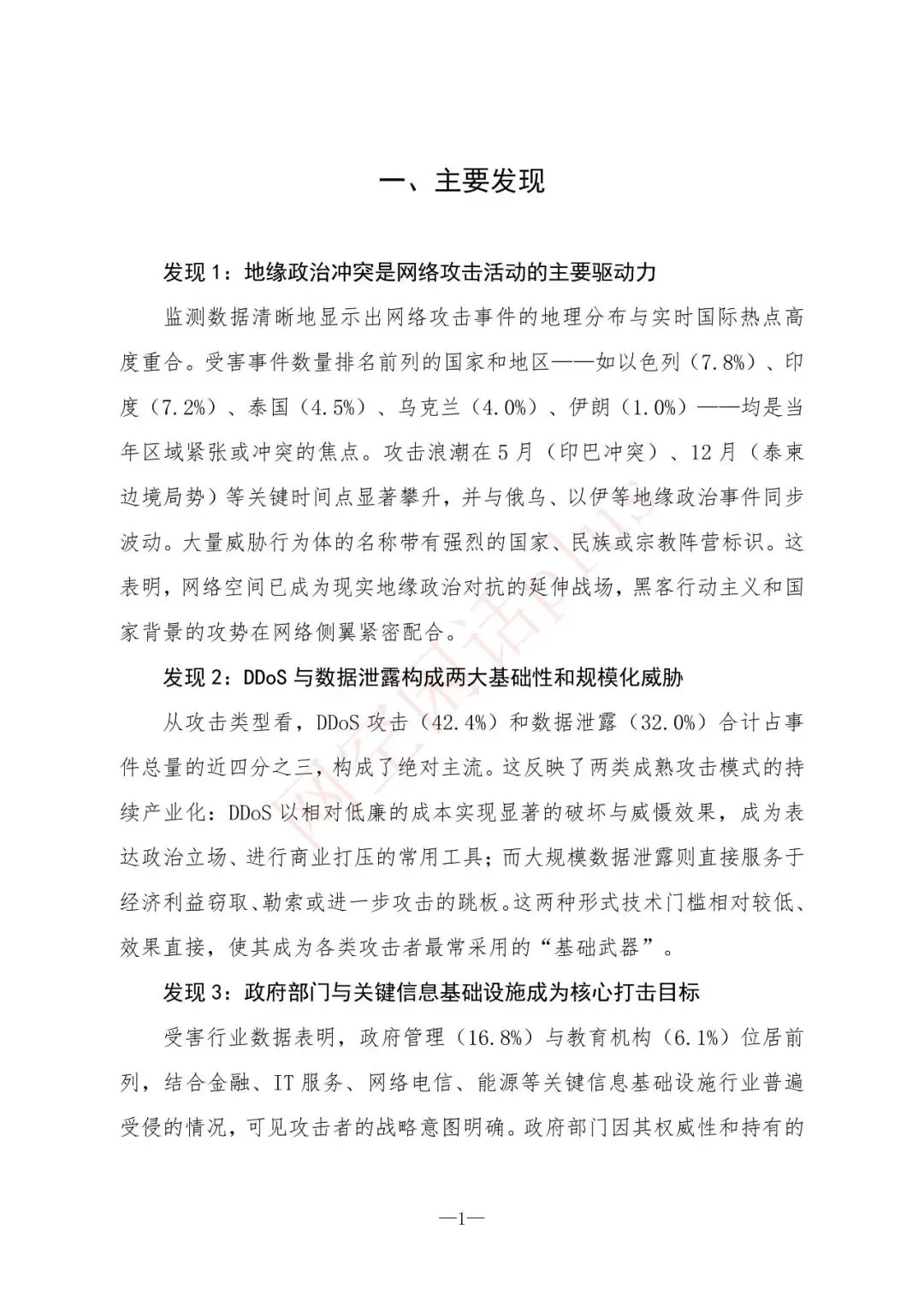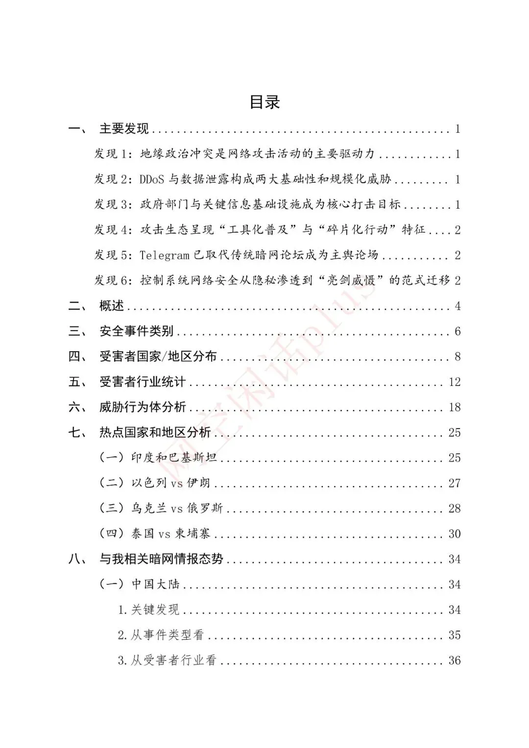报告首先概述了主要发现,包括地缘政治冲突作为网络攻击的主要驱动力、DDoS与数据泄露成为基础性和规模化威胁、政府部门和关键信息基础设施成为核心打击目标等六大发现。随后深入探讨了安全事件类别、受害者国家/地区及行业分布、威胁行为体分析等多个方面,并特别关注了中国大陆和台湾地区的暗网情报态势,以及控制系统网络安全事件的洞察。