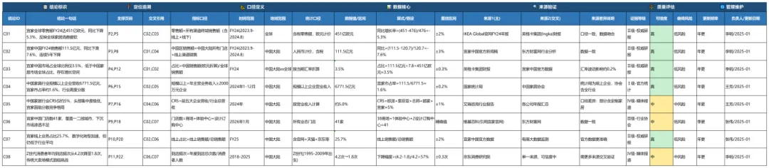 证据台账的核心已经说明,不是贴链接来源,而是回答:你怎么得出这个结论?我建议你至少有这些字段:结论ID、结论一句话、支撑页码、指标口径、数据值、算式、来源、差异说明、可信度品级、更新频率和负责人。