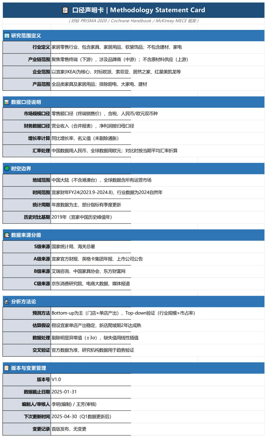 真的,完全不是一回事。参考文献是我看过这些材料,引用借鉴;证据台账是我这个结论怎么来的,你随时可以去核实验证。它必须写清:指标口径,比如零售额、出厂额,含税不含税,是否含平台;时间范围,比如自然年、财年,历史和预测等;地域范围,全国,某省,是否含港澳台等;算式与假设,核心假设是什么;差异说明,为什么两个来源不一样?