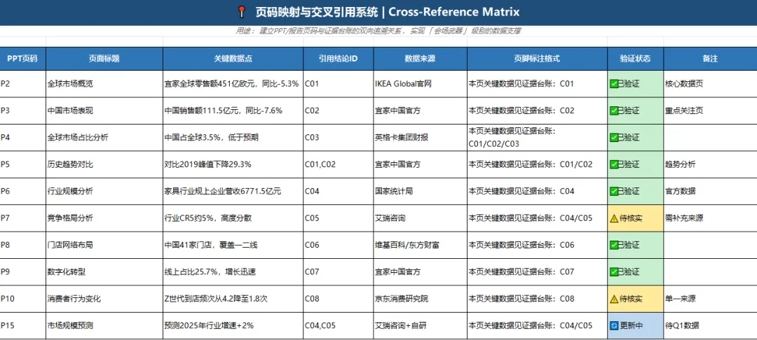 我们都知道,台账最大的价值在会场。所以你必须做页码映射:在台账里写清楚,这条证据支撑ppt的哪一页,哪一句?ppt页脚也写清,每页关键数据见台账C01.
