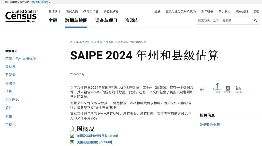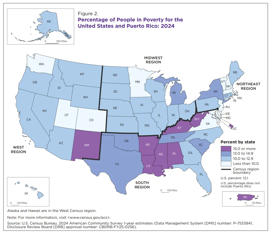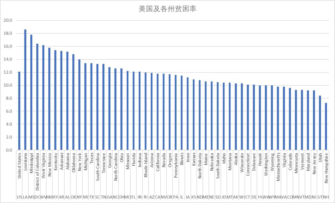 截止至2025年12月15日,美国人口和经济数据官方网站数据显示全美贫困人口有四千多万,贫困率12.1%,各州贫困人数和贫困率如下表: