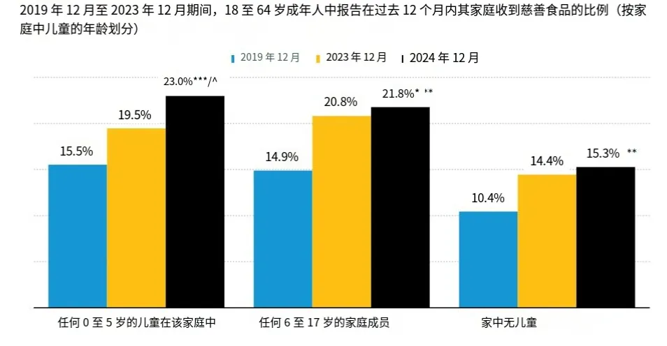 2024 年家庭在购买食物方面仍面临持续挑战——超过四分之一的成年人表示存在食物不安全问题,这一比例与 2023 年所观察到的高比例持平。
