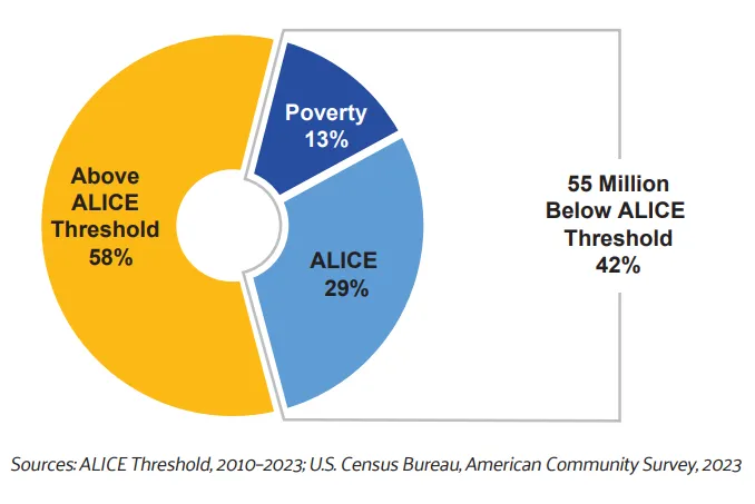 合计42%(5480万户)美国家庭处于“ALICE阈值”以下,即财务困难状态。