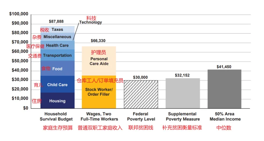 但报告发现,另有29%(3830万户)家庭收入虽高于贫困线,却无法负担所在县的基本生活成本——这就是ALICE。