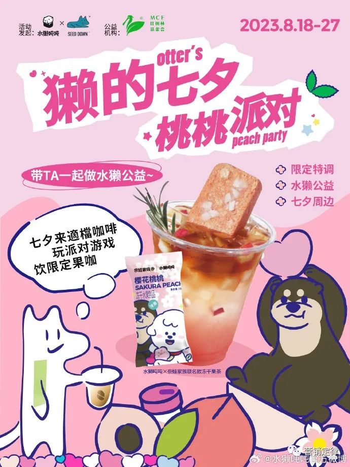 不仅如此,8 月 18-27 日,水獭吨吨还将与红树林基金会 MCF 和来自广州的適檔咖啡准备一场线下的桃桃派对,带来别样桃桃特调果咖,打造射箭游戏赢七夕周边活动,并邀请大家一起加入到水獭公益中来。